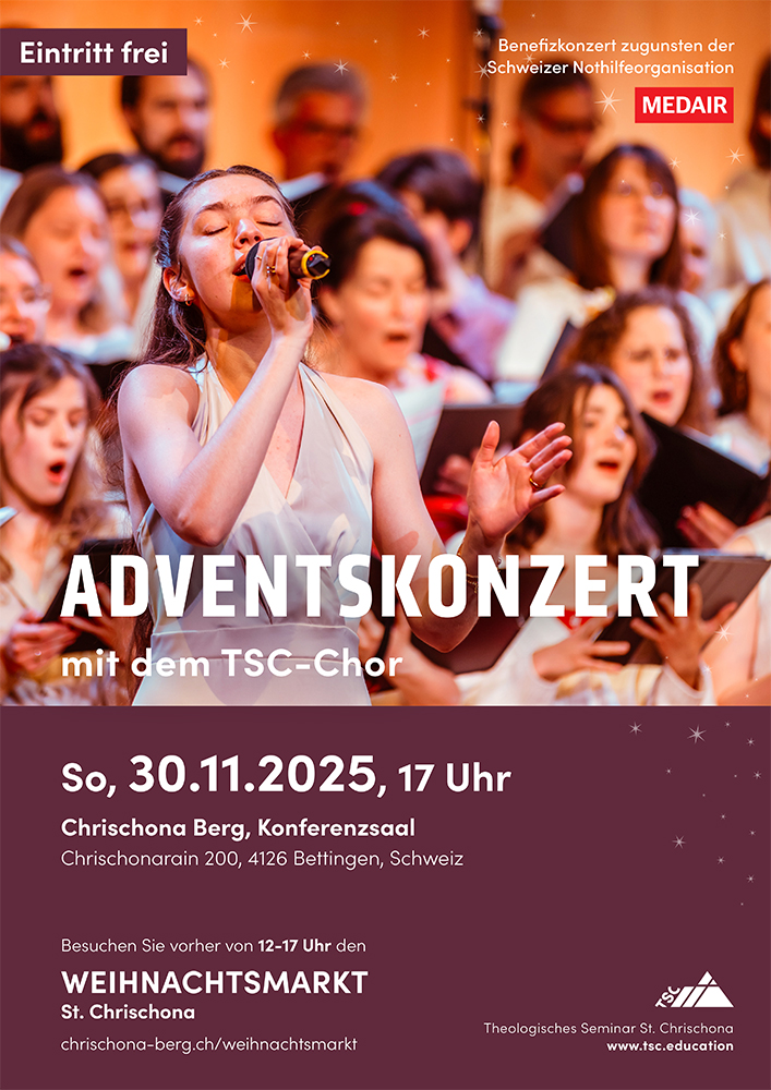 Der Chor des Theologischen Seminars St. Chrischona (TSC) lädt dich herzlich ein zum Adventskonzert am Sonntag, den 30. November 2025, ab 17 Uhr auf dem Chrischona Berg. Du darfst dich auf weihnachtliche Klänge, Choräle, Gospels, klassische und moderne Werke freuen. Der Eintritt ist frei. Die Kollekte geht je zur Hälfte an das Hilfswerk MEDAIR Schweiz und ans TSC.