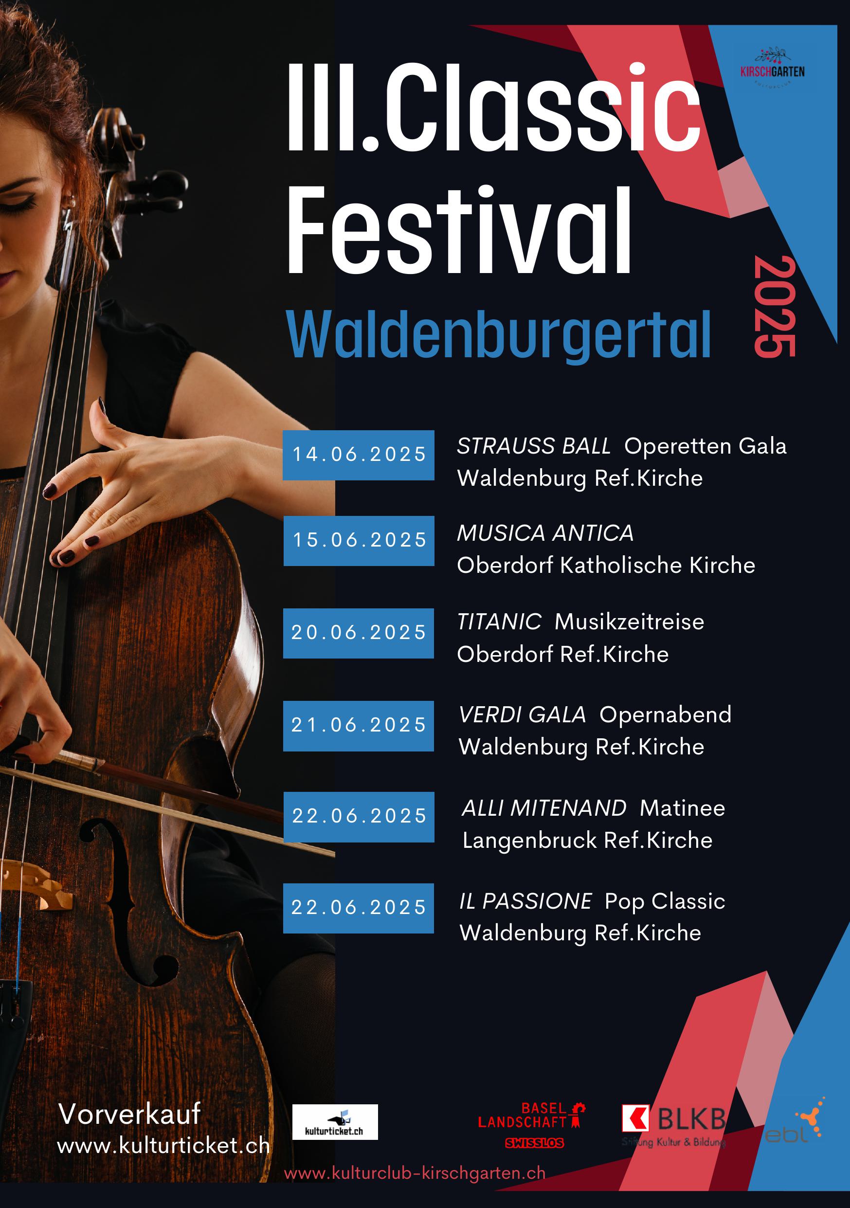 Wir freuen uns, den Start des III. Classic Festival Waldenburgertal 2025 bekannt zu geben, mit dem wir unsere wunderbare musikalische Reise, die erst vor zwei Jahren begann, im Jahr 2025 fortzusetzen. Die Philosophie des Festivals liegt in der Vielzahlt der musikalischen Genres und Stile und wird damit dem Festivalmotto "Klassik für Alle" gerecht. Im Laufe der Festivaljahre standen unter anderem Barockmusik, Oper, brasilianische Bossa Nova und Pop-Klassiker auf dem Programm. Das hohe musikalische Niveau wurde vom Publikum und Presse sehr geschätzt. Das anspruchsvolle Festivalprogramm bleibt auch im Jahr 2025 seinen Grundsätzen und seiner Philosophie treu - 6 Festivalkonzerte präsentieren das breiteste Spektrum musikalischer Kunst.