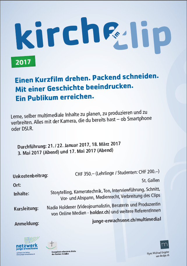 Kirche im Clip 2017: 21./22. Januar, 18. März, 3. Mai* (Abend) und 17. Mai* (Abend)