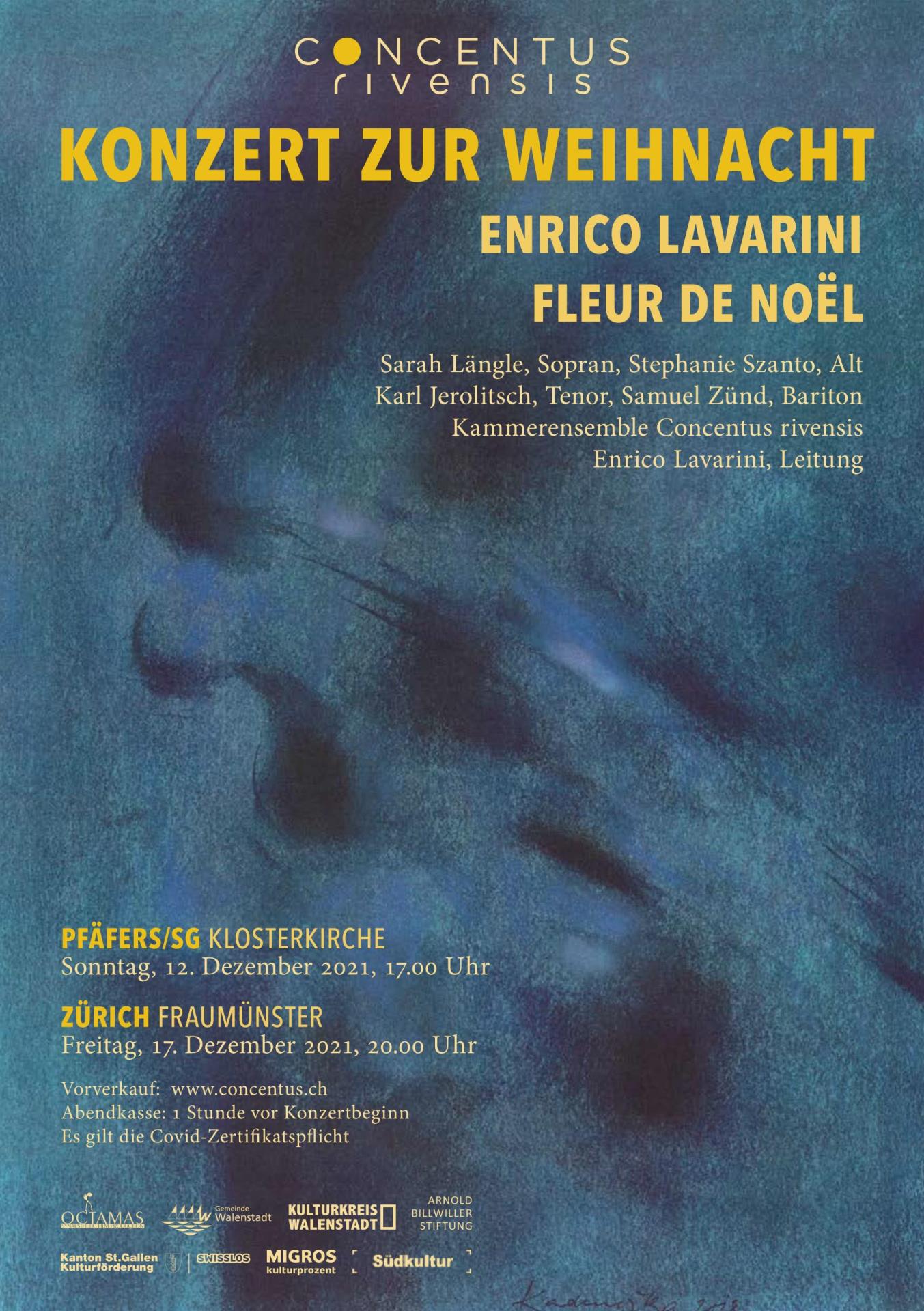 Unter dem Konzerttitel Fleur de Noël führen Sarah Längle (Sopran), Stephanie Szanto (Alt), Karl Jerolitsch (Tenor), Samuel Zünd (Bariton) und ein Ensemble des Concentus rivensis Variationen über Es ist ein Ros’ entsprungen und Ausschnitte aus dem grossen Weihnachtskonzert Quem pastores laudavere des Komponisten Enrico Lavarini unter dessen Leitung auf. Das Kammerensemble ist besetzt mit Streichern, Klarinette und Harfe.