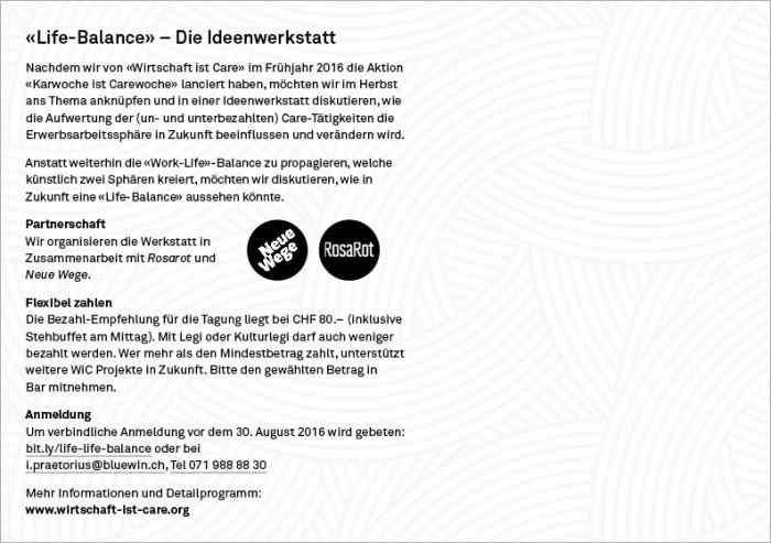 In der Ideenwerkstatt soll diskutiert werden, wie die Aufwertung der (un- und unterbezahlten) Care-Tätigkeiten die Erwerbsarbeitssphäre in Zukunft beeinflussen und verändern wird. Anstatt weiterhin die «Work-Life»-Balance zu propagieren, welche künstlich zwei Sphären kreiert, soll diskutiert werden, wie in Zukunft eine «Life-Balance» aussehen könnte.