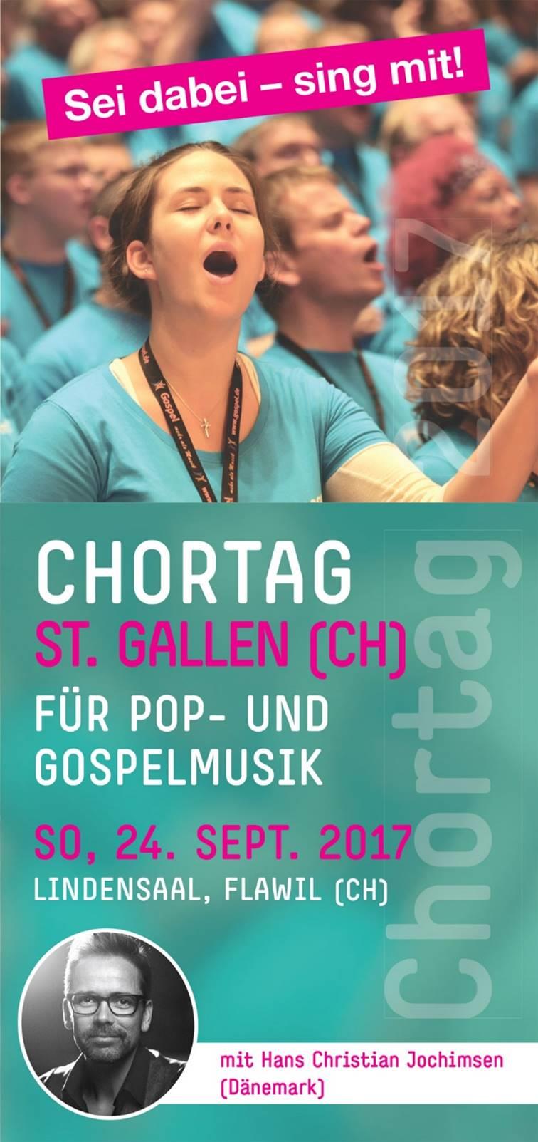 Der Chortag für Pop- und Gospelmusik mit Hans-Christian Jochimsen am 24.September 2017 ist nun definitiv aufgegleist! Die Arbeitsstelle populäre Musik der Evangelisch-reformierten Kirche des Kantons St. Gallen und der Gospelchor Flawil freuen sich als lokale Veranstaltungspartner sehr auf diesen vielversprechenden Tag und laden alle Interessierten herzlich dazu ein – insbesondere ganze Chöre und Chor-Delegationen sind hochwillkommen. Einen Eindruck von einem Chortag mit Hans-Christian gibt’s hier: Am Schluss des Tages werden die erarbeiteten Lieder in einem Gottesdienst um 17.30 Uhr präsentiert.