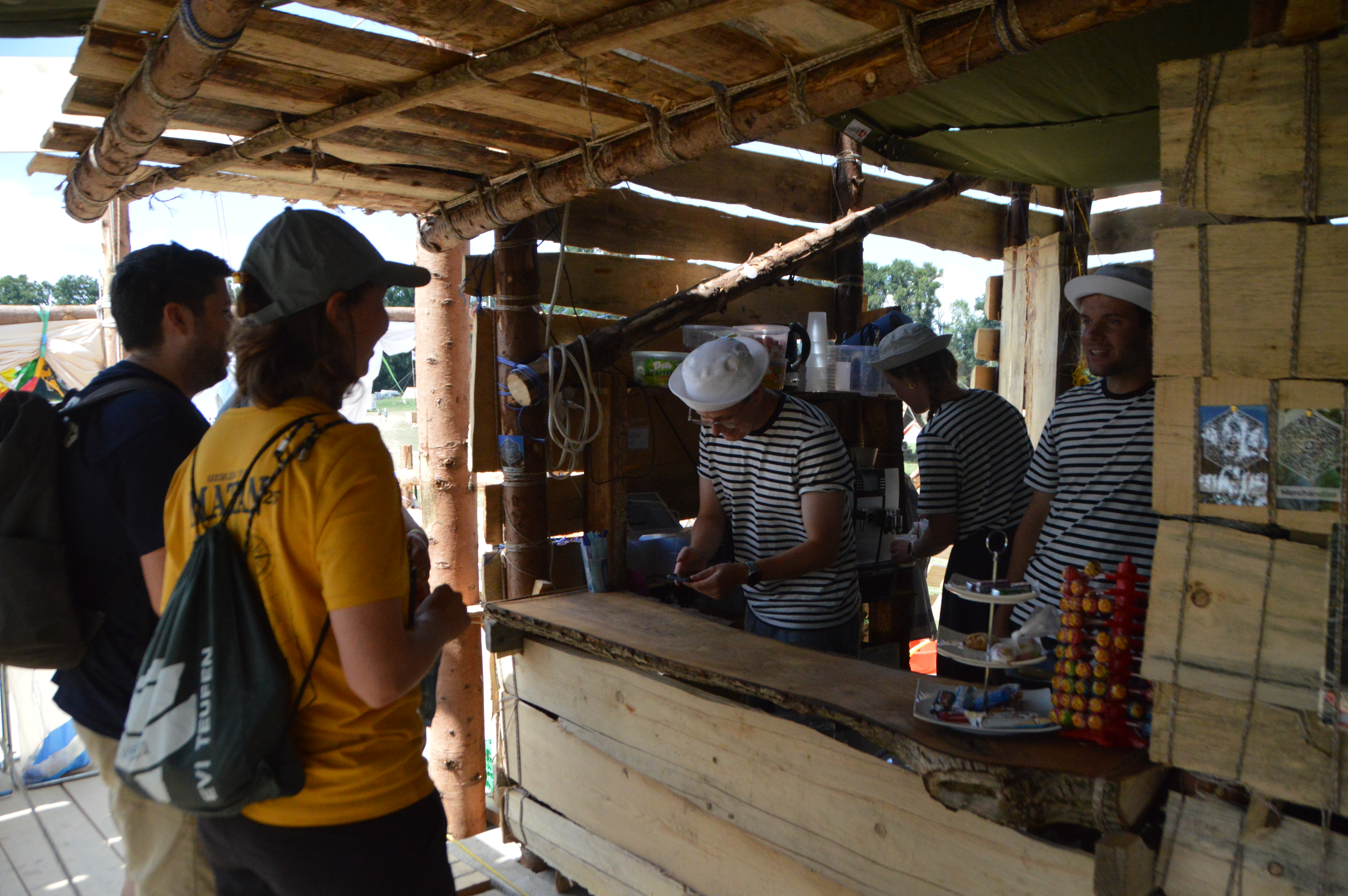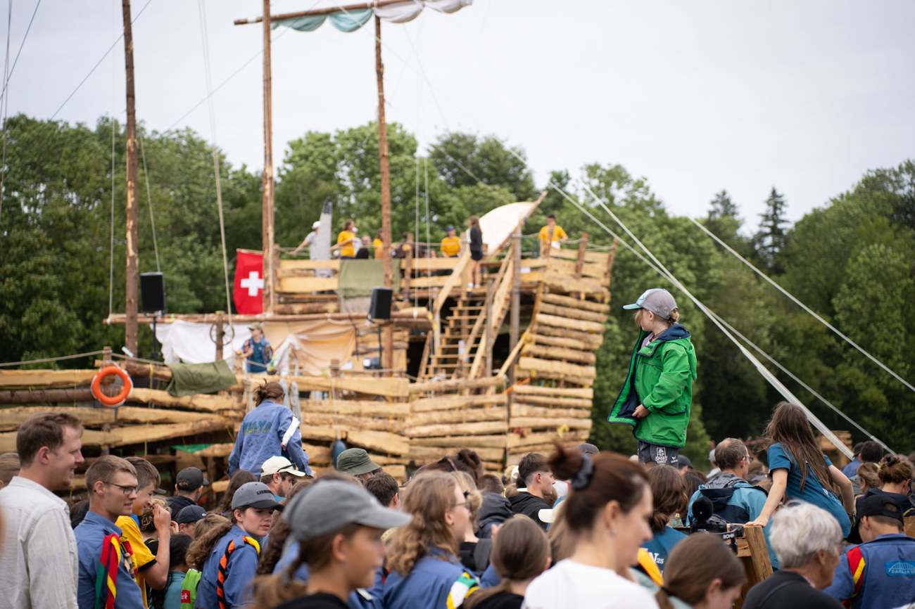 Angekommen auf dem Lagerplatz, fiel sofort das riesige Schiff auf, das im Sommerlager als Treffpunkt diente. Es ist das Schiff, mit welchem die Siedler aus der Lagergeschichte auf der Insel Matan angekommen sind. Aufwändig erbaut aus Holz, ohne eine einzige Schraube oder Nagel, wurde auf dem Entdeckerschiff ein Kaffee sowie ein Kiosk betrieben, an welchem Klein und Gross in der Freizeit Süssigkeiten schnabulieren oder einen Eiskaffee geniessen konnte.
