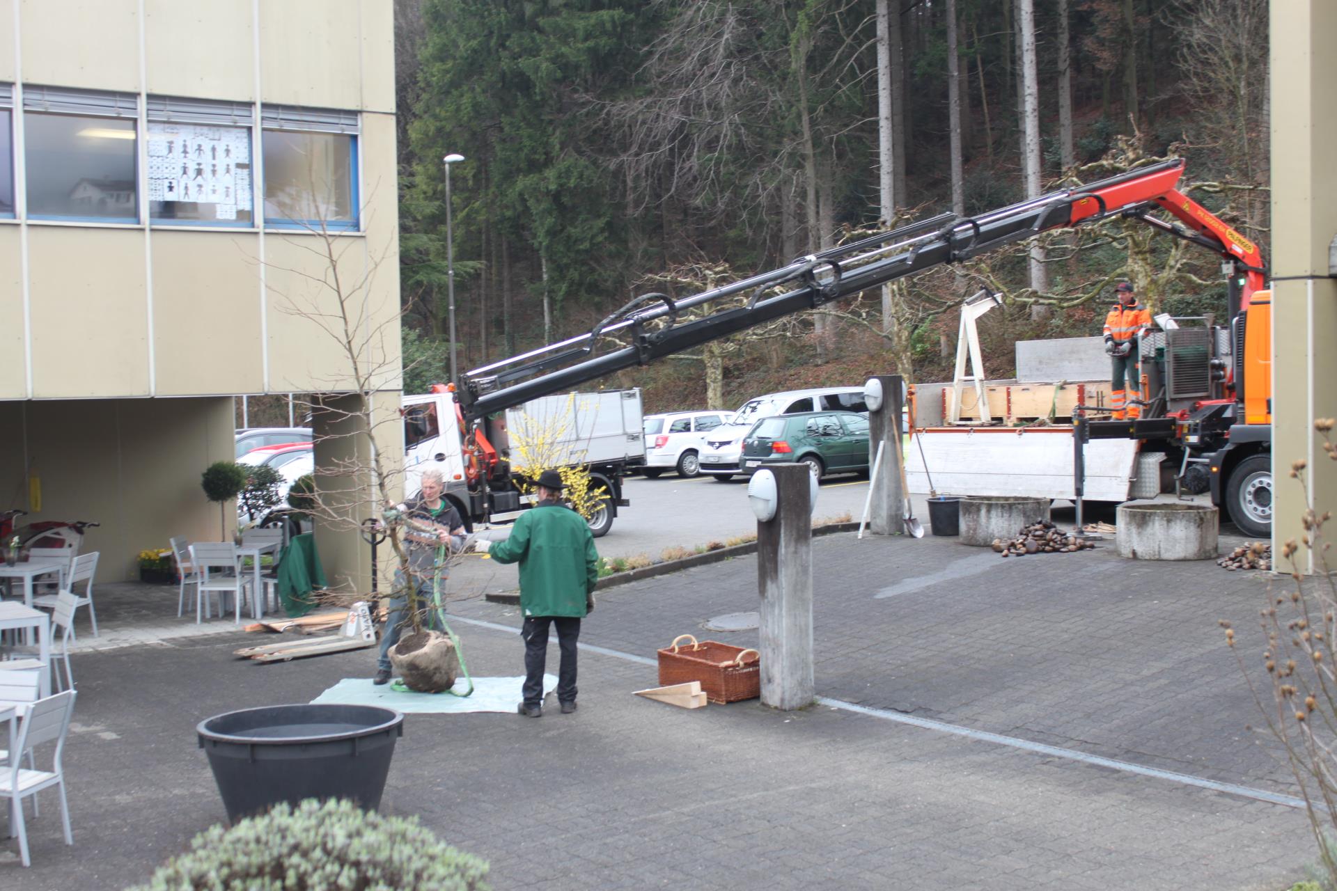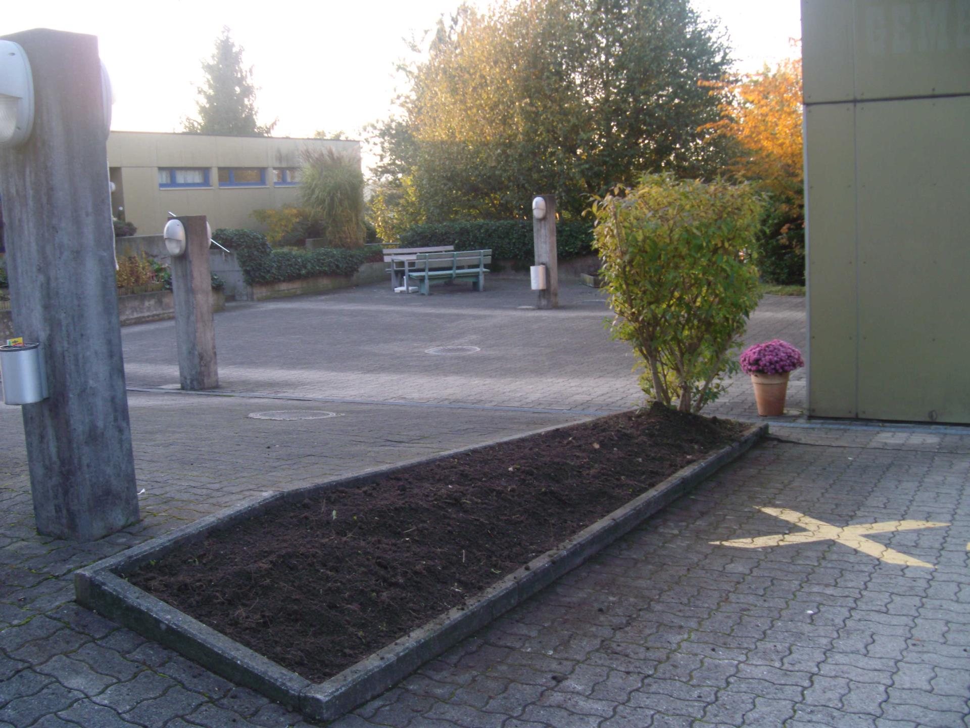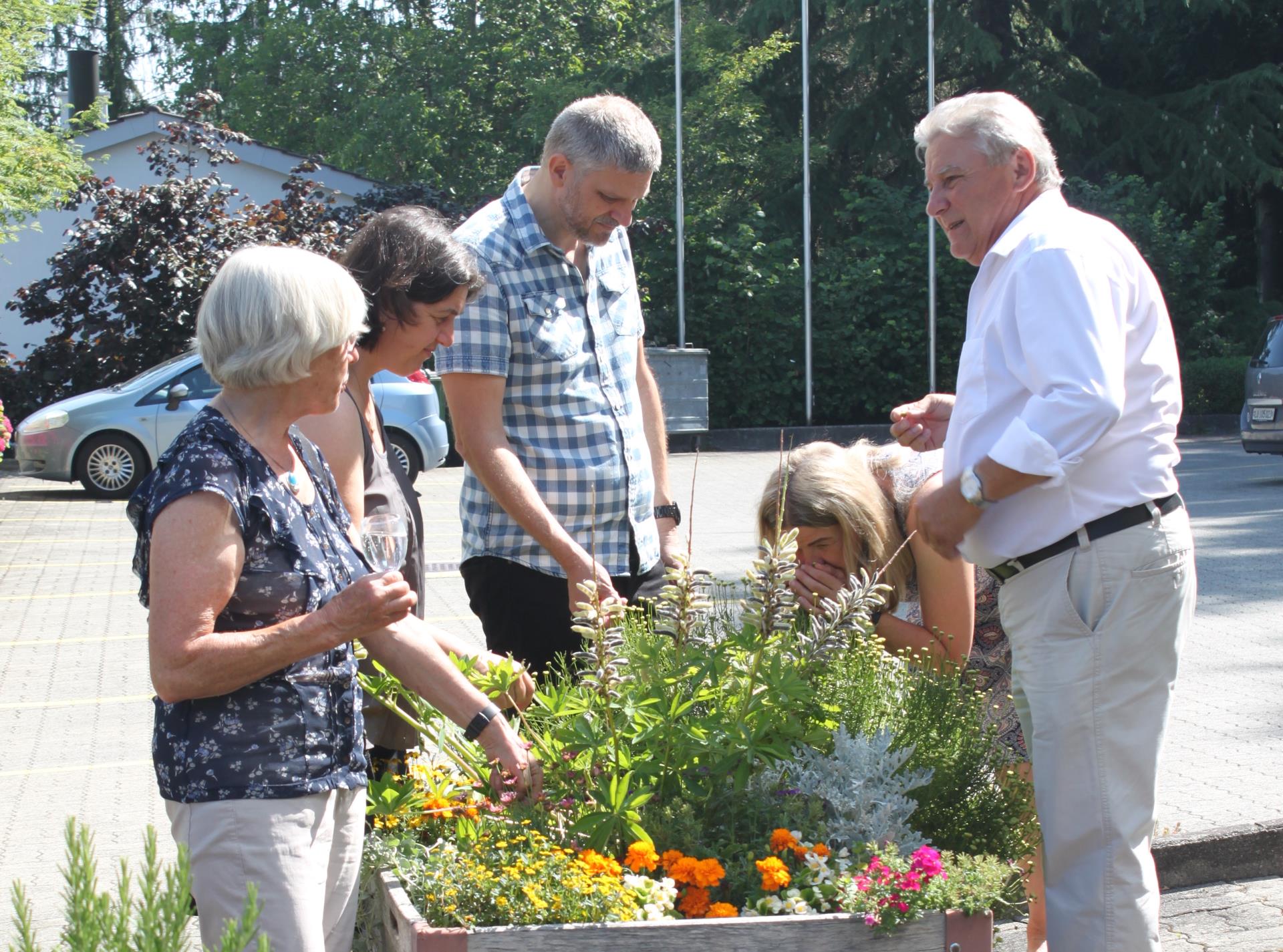 Also machte sich Matucci-Gros auf die Suche nach einem Sponsor. Diesen fand sie in der Stadtgärtnerei, die vier Kisten zur Verfügung stellte. Gefüllt, mit geeigneter Erde, wurden die Hochbeete mittels eines Krans, auf dem gepflasterten Vorplatz aufgestellt. Das war vor einem Jahr. Damals hätte man noch ausprobiert, «Blumen und Kräuter wilddurcheinander gepflanzt.», sagt Matucci-Gros.Dieses Jahr hätte sie beschlossen, professioneller zur Sache zu gehen. Mit Hilfe einer Hobby-Gärtnerin wurden ein Gemüse-, ein Blumen-, ein Salat- und ein Kräuterbeet gepflanzt. Mit Erfolg. Snack Auberginen, Schnittlauch, Zitronenmelisse, Salate und ein Kürbis, Tomaten und Radieschen spriessen. Auch der Apfel- und der Kirschbaum tragen bereits Früchte. Und ein Liquidambar-Baum mitten auf dem Platz sorgt im Herbst für eine schöne Färbung.