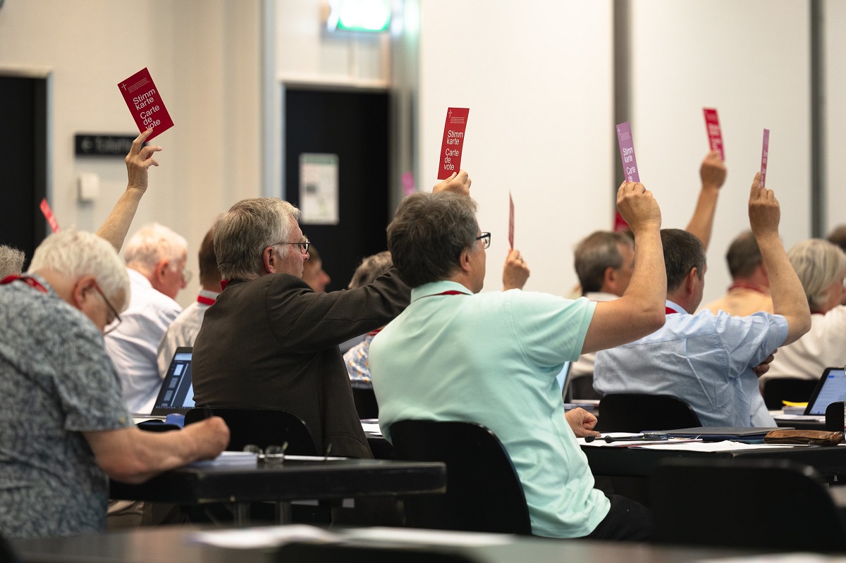 Im Saal sind die Plätze schon angeschrieben, wir Thurgauer sitzen zuvorderst, weil Haru Vetsch als Stimmenzähler amtiert. Neben mir Urs Steiger - neben und hinter uns die Appenzeller und St. Galler und Zürcher und Schaffhauser, bzw. die -innen, aber insgesamt ist es eher männerlastig. Jeder Kanton hat abhängig von der Mitgliederzahl 1 (Uri) bis 9 (Zürich) Synodale, und heute sind es 66 Stimmberechtigte plus Gäste aus unterschiedlichen Vereinen und Verbänden.