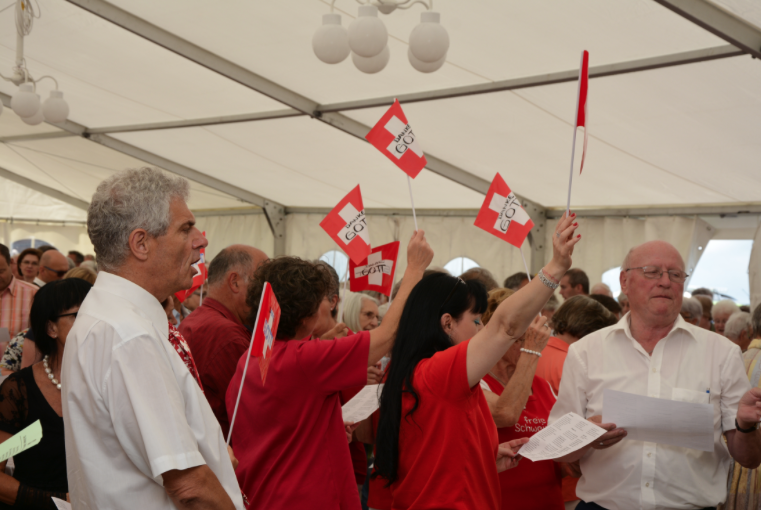 Auch das Jodelduett sang mit ihren Texten «Vertrauen» in die Herzen. Mit Begeisterung ertönte auch die Landeshymne und klang aus mit einem «1.August Jodel» angestimmt von Roman Duering. Unser tiefsinniges Thurgauerlied wurde von Herzen gesungen. Es ist im 19.Jahrhundert im alten Schulhaus Hosenruck entstanden. Es wäre wünschenswert, wenn die Fürbitten für Land und Kanton, die von namhaften Persönlichkeiten vorgetragen wurden, ganz allgemein, aber ganz besonders an den vielen 1. August-Reden zum Thema gemacht würden. Es wurde einem erst richtig bewusst, was Freiheit bedeutet, wenn für verfolgte Christen in den Kriegsgebieten grosszügig stille Gaben in die Körbchen gelegt wurden. Angesichts der Weltlage können wir nur beten: «Dein Reich komme…»
