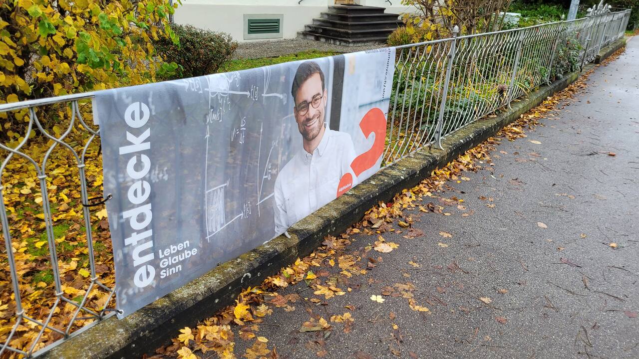 Am Gartenzaun des Pfarrhauses wirbt ein Plakat für den Alphalive-Glaubenskurs. Foto: sd