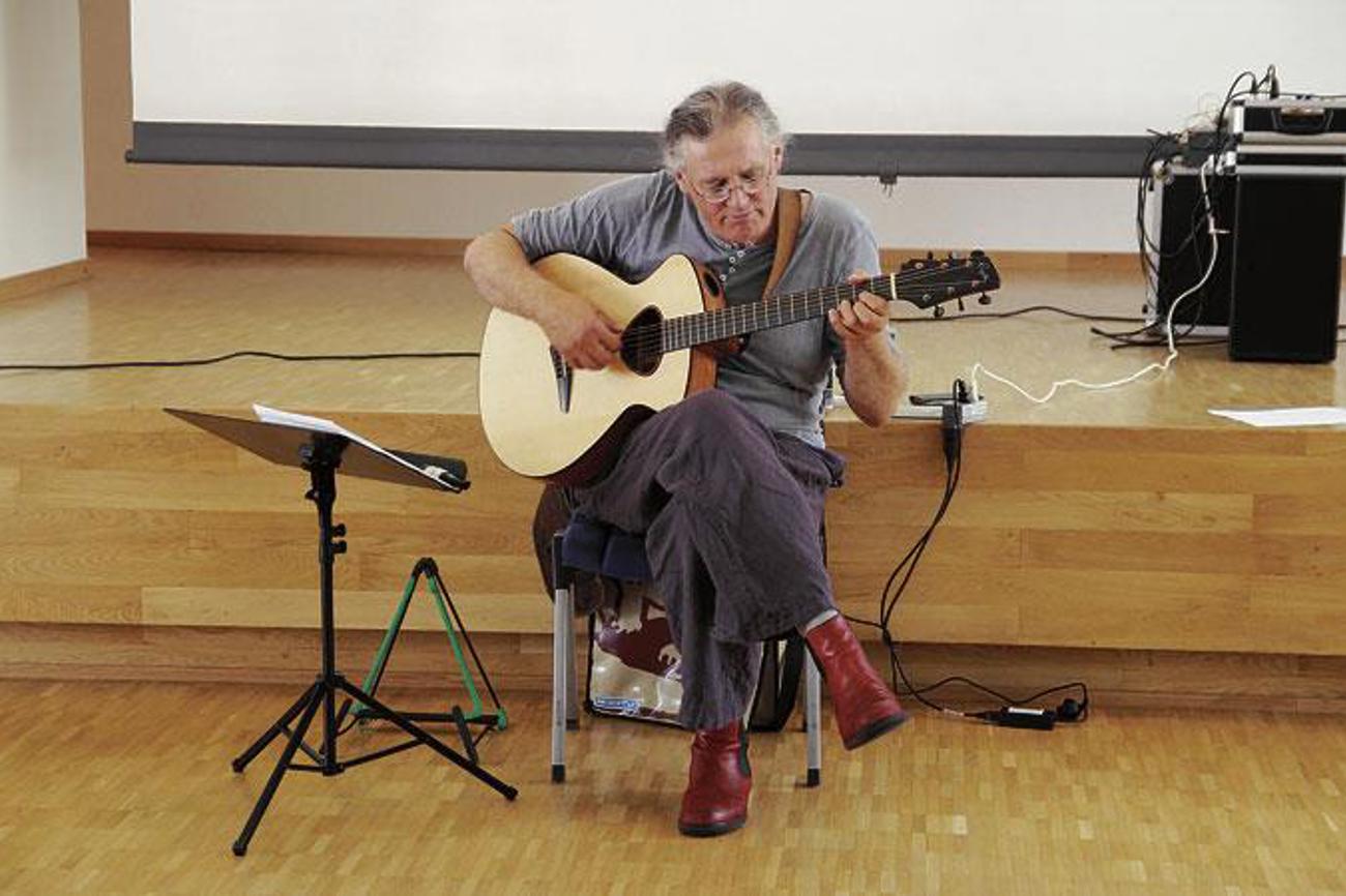 Helles Licht fällt durch die Fenster. Staub tanzt in der Luft. Vorne steht Linard Bardill, wie man ihn aus den Medien kennt: Flatternde Hose, runde John-Lennon-Brille, das störrische Haar in einem Pferdeschwanz gezähmt und als i-Tüpfelchen die roten Schuhe. Hier steht einer mitten im Leben.