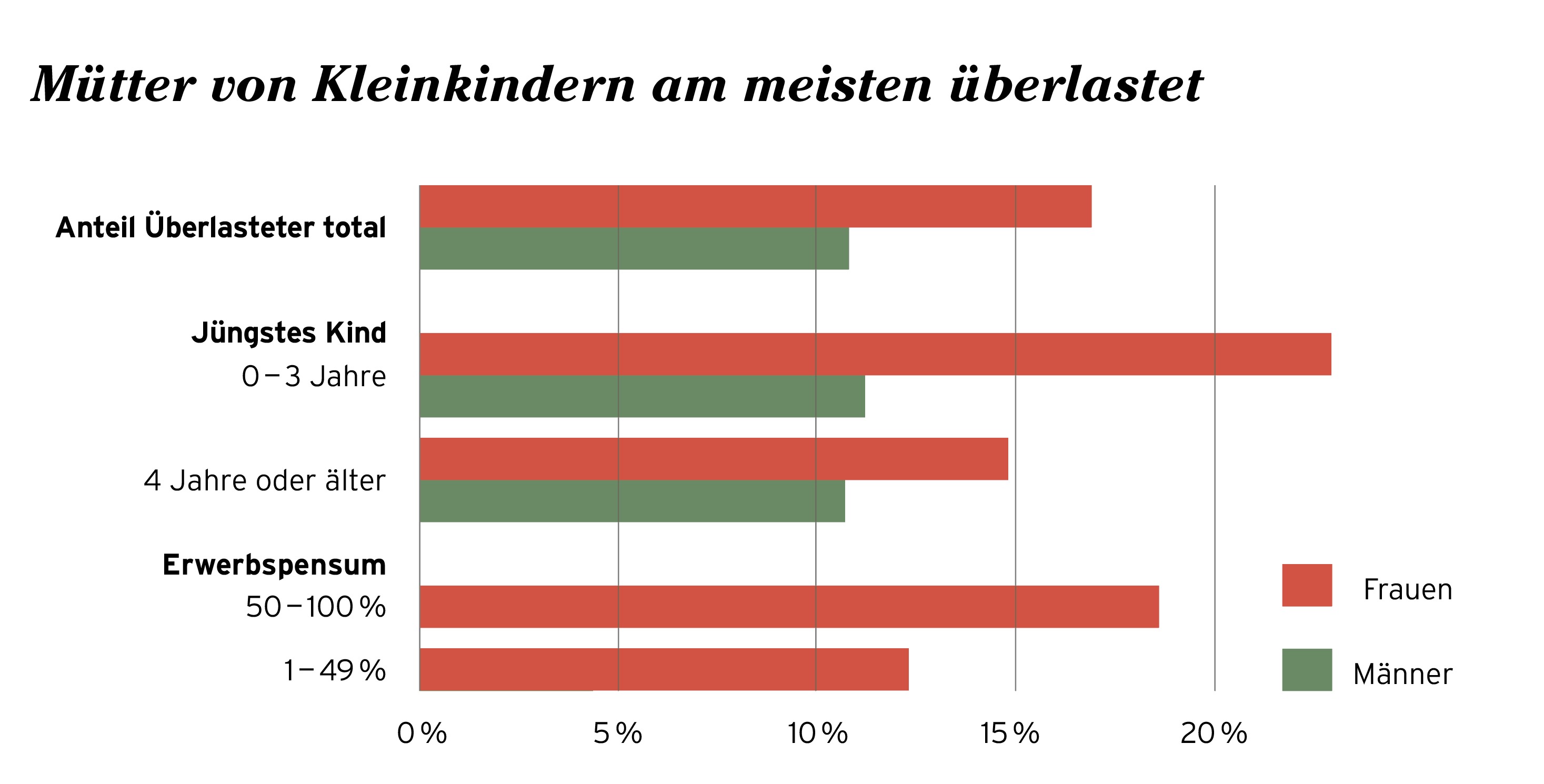 Anteil der Befragten, die das Gefühl haben, überlastet zu sein und Schwierigkeiten zu haben, die verschiedenen Aktivitäten unter einen Hut zu bringen. Erwerbstätige Personen im Alter von 25 bis 54 Jahren mit Kindern unter 25 Jahren im Haushalt. Bei Männern ist eine Differenzierung nach Pensum nicht möglich wegen der geringen Zahl von Teilzeiterwerbstätigen. Quelle: BFS – Erhebungen zu Familien und Generationen, 2021.