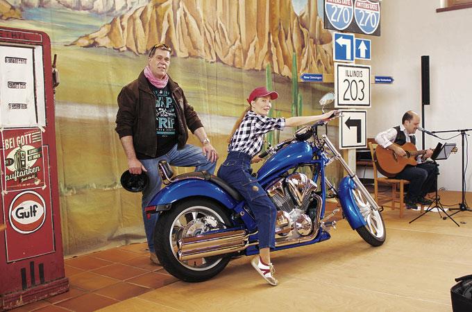 Als der letzte Schlag der 10-Uhr-Glocke verhallt, erklingt in der Western-Kulisse die helle Stimme des Sängers Andreas Wildi. Mit seiner Gitarre stimmt er den Song «wake me up» von Avici an. Die Kulisse in der Kirche ist beeindruckend: Links neben der blauen Harley steht der Saloon, rechts hängen an einem grossen Kreuz befestigte Strassenschilder. «Highway to Heaven» geht es mir spontan durch den Kopf. Im blitzblank polierten Chromstahl der Harley spiegeln sich die Kirchenorgel und die in Leder gekleideten Gottesdienstbesucher. In der Predigt und einem humoristischen Theater erzählen die Pfarrerin und der Sozialdiakon, dass die Bibel ein Buch der Reise sei und «Gott «on the road again ist – quasi auf der «Strasse des Lebens ». Das Christsein sei etwas für Leute, die gerne unterwegs sind. Auch Abraham, Isaak und Jakob wanderten als Viehhirten umher», erklärt die Pfarrerin. «Christen sind unterwegs zum Leben, unterwegs in Freiheit, befreit durch die Hoffnung auf das Reich Gottes. Sie sind nicht gezwungen, alles in das irdische Leben packen zu müssen.»