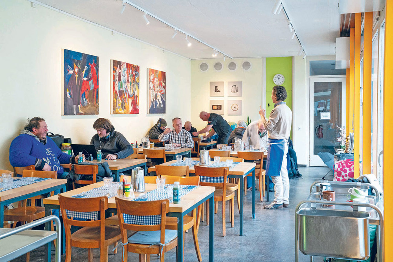 Das Angebot des Treffpunkts ist vielfältig: An einer Wand hängen Zeitungen zum Lesen. An gemütlichen Holztischen sitzen die Gäste und unterhalten sich. «Wir unterstützen die Besucher und Besucherinnen beim Schreiben von Bewerbungen und stehen ihnen im Kontakt mit Amtsstellen beiseite. Dann und wann gibt es einen medizinischen Notfall.» Giertz muss dabei abwägen: «Wo können wir konkret helfen, und wen müssen wir an Fachstellen delegieren?» Besonders beliebt sind die geselligen Veranstaltungen wie der jährliche Ausflug und die Weihnachtsfeier.