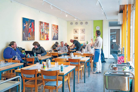 Wer den Treffpunkt Gundeli betritt, muss zunächst einen Durchgang passieren und gelangt dann ins Gebäude im Hinterhof. In den Räumen herrscht reges Treiben. Es ist voll. Die Gäste sitzen an ihren Plätzen und warten gespannt auf das Vier-Gang-Menü, das bald serviert wird. Kostenpunkt: 6 Franken. Fabien Heitz, der energische Elsässer, schwingt in der Küche die Kochlöffel. Wer nicht bezahlen kann, erhält kostenlos eine Suppe mit Brot. Rund 25 Menüs und einige Suppen werden hier täglich serviert. «Es ist uns wichtig, dass wir gesunde und abwechslungsreiche Mahlzeiten anbieten können», betont Giertz.