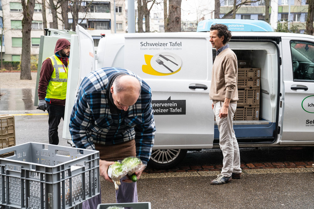 Vor dem Haus am Winkelriedplatz in Basel hält ein weisser Lieferwagen der Schweizer Tafel mit der Aufschrift «Essen verteilen – Armut lindern». Der Koch und die Freiwilligen des Treffpunkts eilen herbei, um die Lebensmittel entgegenzunehmen. In den Kisten befinden sich abgelaufenes Gemüse und Obst sowie Brot und Backwaren. Rasch wird alles nach oben gebracht. Auch Michael Giertz, der Leiter des Treffpunkts, packt mit an. «Wir bekommen jeden Tag eine Lieferung von der Basler Tafel. Das sind enorme Mengen – und wir kriegen sie geschenkt», erklärt er.