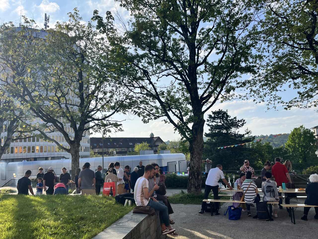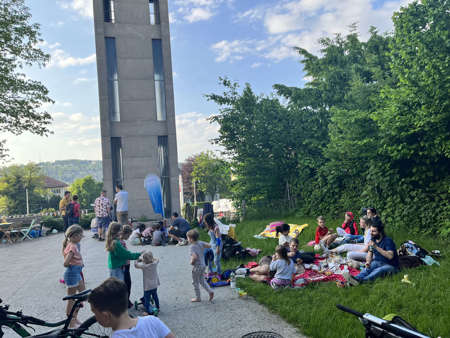 Sie stellte die Infrastruktur zur Verfügung, die Festbänke und den Grill auf. Die beteiligten Familien schleppten einen weiteren Grill heran, dekorierten die Tische. Und dann kamen sie, die Nachbarn. Sie strömten aus allen Richtungen zur Kirche, setzten sich hin, breiteten Decken aus, liessen sich auf der Wiese nieder. Viele nutzten das Angebot, selber Mitgebrachtes auf dem Grill in ein leckeres Essen zu verwandeln. Schnell kamen die Erwachsenen ins Gespräch: Hier kannte man sich bereits, dort nur vom Sehen. Neu wissen sie: Das sind unsere Nachbarn.