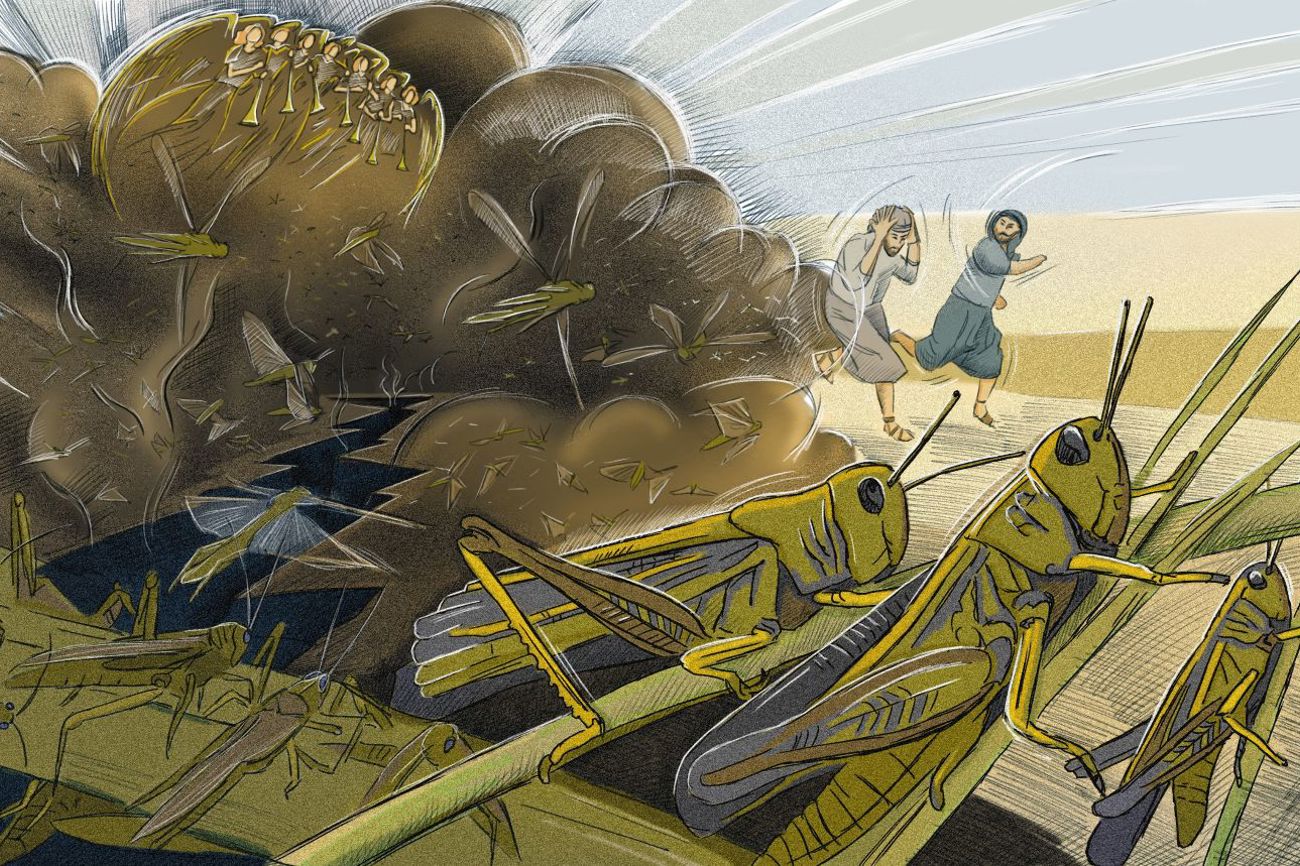 Die Heuschrecken in Kapitel 9 der Offenbarung jedoch sollen auf Geheiss Gottes dem Gras auf der Erde, den grünen Pflanzen und den Bäumen keinen Schaden zufügen. Da sie mit der Kraft der Skorpione ausgestattet sind, sollen sie die Menschen mit ihrem Stachel quälen. Gott hat ihnen jedoch bestimmte Vorgaben erteilt: Nur an jenen sollen sie ihr verderbliches Werk ausüben, die nicht das Siegel Gottes auf ihrer Stirn tragen. Die gottlose Masse der abgefallenen Israeliten soll bestraft werden. Die Menschen werden nicht zwingend physisch gequält.