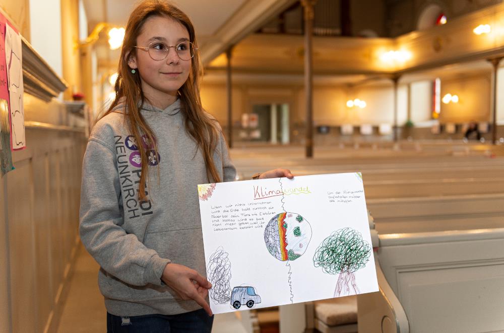 Das Bild zeigt unseren Planeten. Die eine Hälfte ist grün und gesund. Die andere Hälfte ist grau und bröckelt. «Ich habe die Erde gemalt, wie sie vor und nach dem Klimawandel aussieht. Sie sollte grün sein und Wasser haben. Aber durch die grosse Wärme wird sie immer dunkler», erklärt Riana. Die Elfjährige gehört zu den Unterrichtskindern, die im Kanton Schaffhausen Bilder malen, um Spenden für Klimaprojekte zu sammeln.