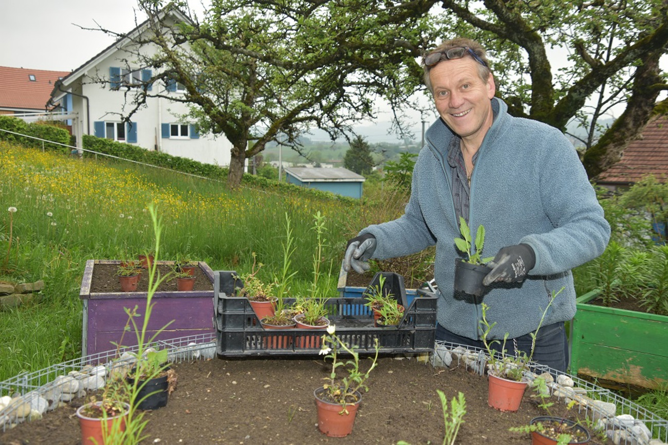 Der «Buntä Chilä Gartä» hinter der Kirche in Sirnach entstand vor drei Jahren auf Anregung von Beno Kehl. «Ich bin Imker und betreue – verbunden mit der franziskanischen Gassenarbeit – viele Bienenvölker. Im Juni beginnt in der Schweiz die Zeit der ‹grünen Wüste›. Die Honigbienen würden verhungern, wenn man nicht zufüttert. Den Wildbienen geht es noch schlechter.» Um für mehr Blütenvielfalt zu sorgen, stellte ihm die Kirchgemeinde Land zur Verfügung. Inzwischen ist aus einfachen Anfängen ein sorgsam gestalteter Garten geworden: Sechs Kreise sind wie Blütenblätter um ein Zentrum angelegt. Jeder Kreis hat ein religiöses Thema und ist einem Tag aus der Schöpfungsgeschichte zugeordnet.
