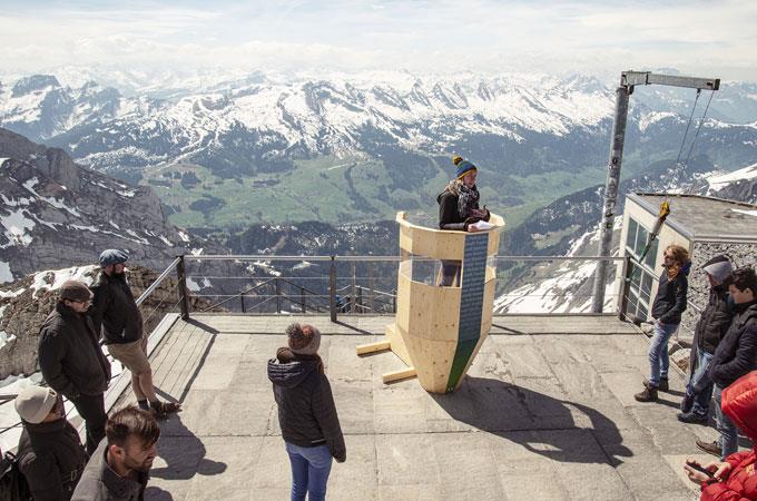 Kritisch, aber auch mit einem Augenzwinkern hätten die jungen Leute am 28. April die mobile Kanzel auf dem Berggipfel bestiegen, teilte das Netzwerk Junge Erwachsene mit. Schliesslich hätten sieben Rednerinnen und Redner auf dem 2500 Meter hohen Gipfel das Wort ergriffen. Für die Veranstaltung war die Kanzel eigens mit der Schwebebahn auf den Säntis transportiert und von dort auf die Aussichtsplattform getragen worden.