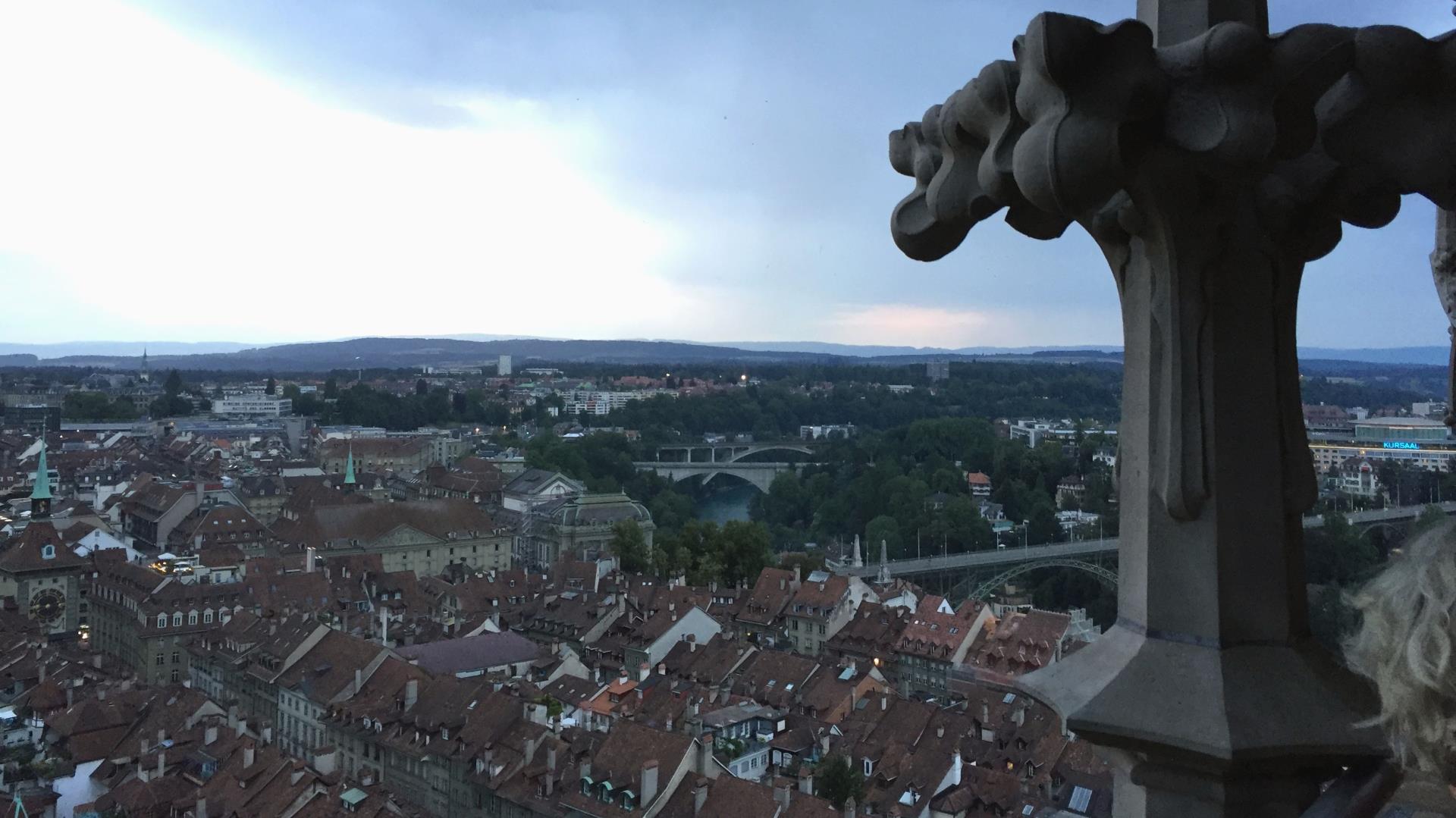 Wer es noch luftiger mag, erklimmt die zweite Galerie auf 64 Metern Höhe. Hier läuft die Höhenangst der Klaustrophobie den Rang ab. Die Aussicht ist aber spektakulär, und man sieht Gurten, Aare, Bundeshaus, blickt in das Dächergewirr und die Gärtlein, kleine Oasen zwischen den hablichen Berner Gassen.