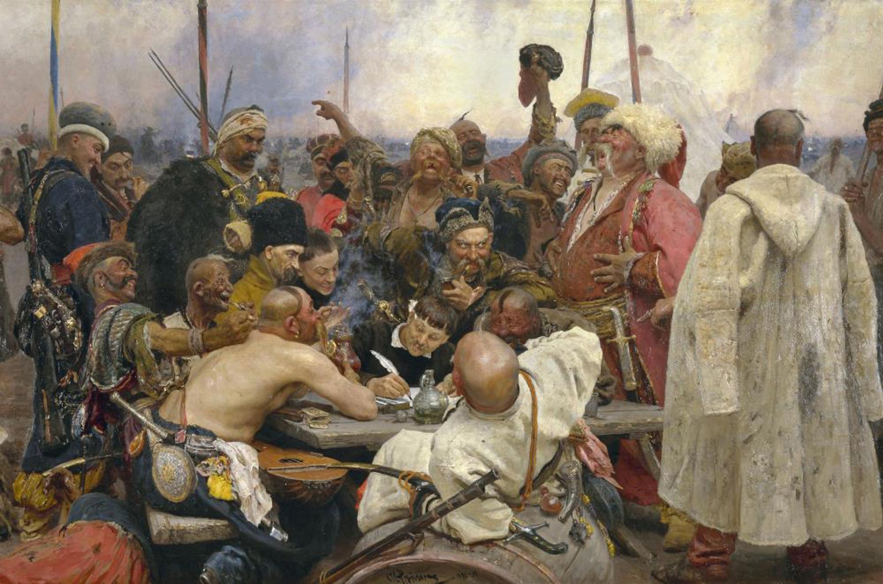 Ein weiteres meisterhaftes Historienbild Repins trägt den Titel «Die Saporoger Kosaken schreiben dem Sultan einen Brief». Die Kosaken in der Region Saporoschje/Saporischschja waren Wehrbauern mit weitreichender Autonomie. Ihr Kosakenstaat am Unterlauf des Dnjepr gilt als eine historische Keimzelle der Ukraine. Das Gemälde zeigt die grobschlächtigen Kosaken lachend und feixend, während sie im Jahr 1676 einem Schreiber den Antwortbrief an den türkischen Sultan diktieren, der die Oberhoheit über die Region beanspruchte. Man kann sich vorstellen, dass der Wortlaut des Briefes von Derbheiten nur so strotzte. Das Gemälde kann aber nicht nur dem ukrainischen, sondern auch dem russischen Nationalismus als Referenz dienen. Zar Alexander III. kaufte es damals für eine Rekordsumme. Schliesslich demonstriert das Bild, wie die raumfremde Macht der Osmanen aus dem russischen Einflussgebiet verdrängt wird – einige Jahrzehnte später wird diese Region als «Neurussland» dem Zarenreich einverleibt werden.