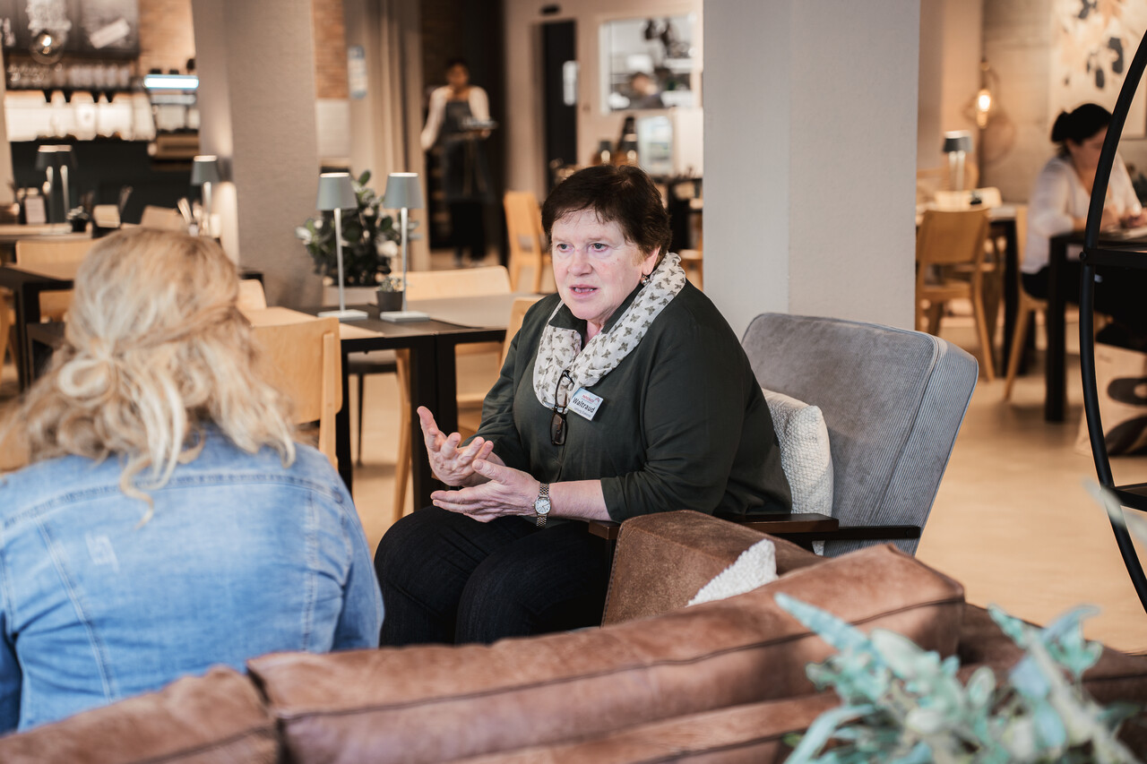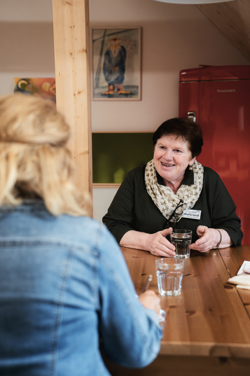 Zwei Frauen sitzen an einem Tisch im öffentlichen Bistro des Papierhofs und lernen Deutsch. Eine Mutter mit zwei Kindern kommt auf einen Kaffee vorbei. Diakonin Waltraud Eggenberger und ihr Team begrüssen Gäste und setzen sich mit einem offenen Ohr für die Sorgen der Menschen mitten in den modern eingerichteten Raum. «Seit wir hier sind, kommen viel mehr Menschen gezielt bei mir vorbei und fragen um Hilfe», erzählt sie.