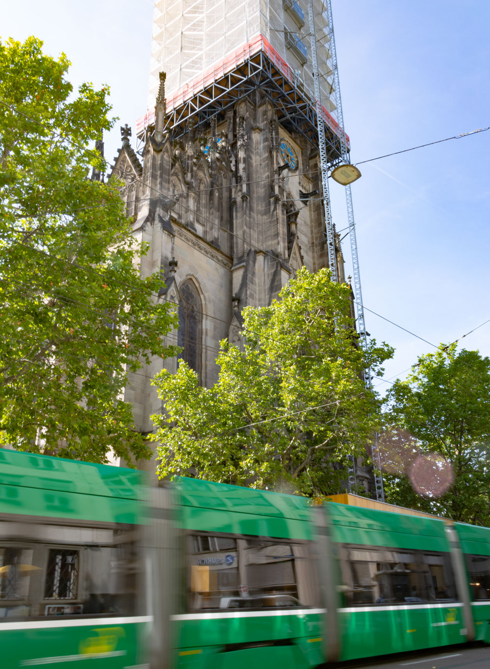 Das bis zur Turmspitze hinaufragende Gerüst gelte wohl als das derzeit spektakulärste in Basel. «Speziell angefertigte Stahlbauteile zur Übernahme von Windkräften – angebracht an der intakten Baumasse im Bereich des Uhrengeschosses – halten das frei auskragende Gerüst des Turmhelms», erklärt Andreas Hindemann. Diese Abspannung müsse pro Turmseite Zugspannungen von bis zu 56 Tonnen aufnehmen können und Windgeschwindigkeiten von über 100 Stundenkilometern standhalten. Um die Angriffsfläche für Windkräfte auf Gerüst und Baumasse möglichst tief zu halten, würden die Gerüstnetze jeweils in den Wintermonaten abgenommen. «Erfahrungsgemäss wüten dann die stärksten Stürme.»