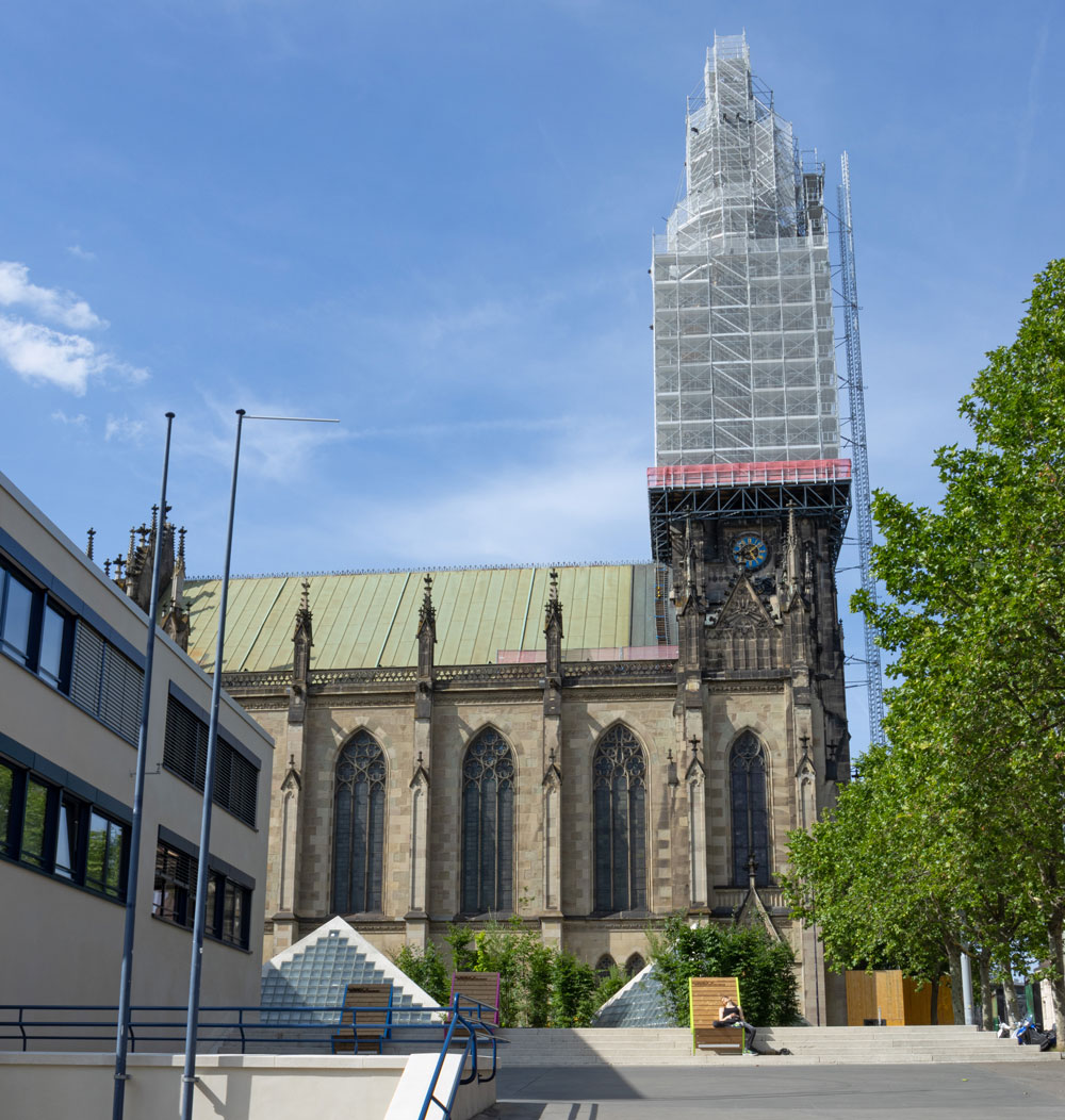Er ist mit 72 Metern höher als die Basler Münstertürme – die Rede ist vom Turm der Elisabethenkirche. Im Vergleich zu seinen zwei mittelalterlichen Kontrahenten sei er allerdings wesentlich sanierungsbedürftiger. «Der verwitterte Sandstein muss restauriert und zum Teil ausgetauscht werden.