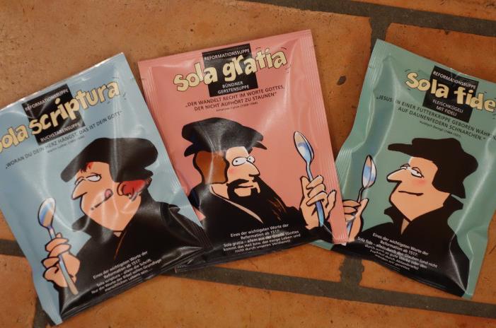 Wulf und Huber waren sich an diesem Abend einig, dass eine Suppe das beste Rezept ist, um die Leute auf eine witzige und einfache Art zu erreichen. «Mit dem Duft der Suppe verbreitete sich ja schon damals die Reformation», sagt Wulf. Durch einen persönlichen Kontakt konnten sie die Migros davon überzeugen, 37'000 Päckchen ihrer Buchstaben-, Fideli- und Gersten-Suppen mit von Grafiker Bruno Fauser speziell gestalteten Reformatoren-Etiketten versehen zu lassen. So prangen die Reformatoren Zwingli, Luther und Calvin auf den Suppentüten, begleitet von den Sprüchen Sola fide (allein der Glaube) und Sola gratia (allein die Gnade) und Sola scriptura (allein die Schrift). «Die Buchstabensuppe ‹Sola Scriptura› kommt besonders gut an», sagt Wulf. «Unsere Käuferinnen und Käufer nehmen die Suppe nach Hause, schauen sie an und denken hoffentlich über den Spruch nach.»