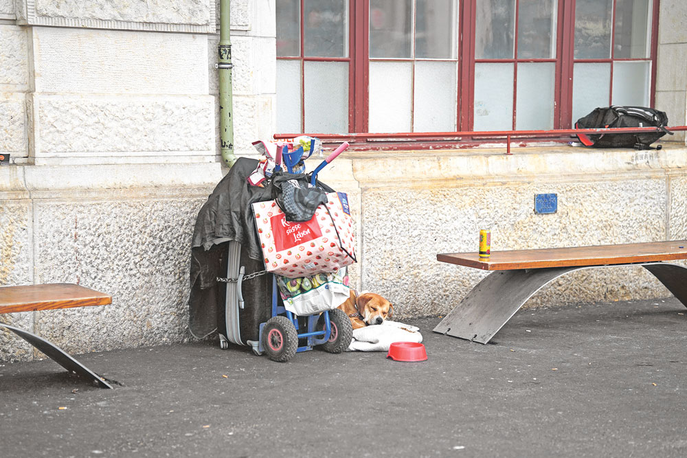 Ein Hund schläft am Bahnhof SBB neben dem Gepäck eine Obdachlosen.