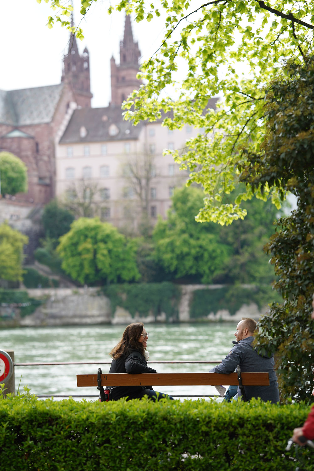 Monika Widmer und Michael Schäppi sitzen zum Abschluss auf einer Bank am Rhein und unterhalten sich.