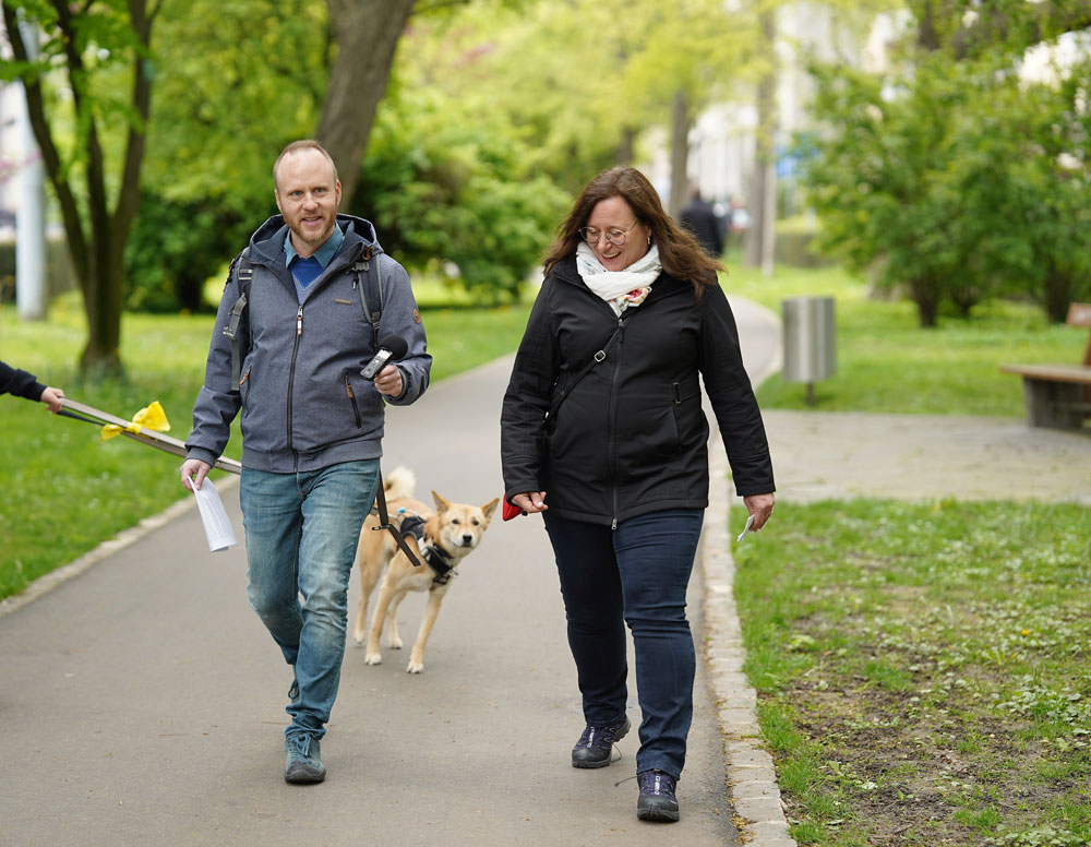 Monika Widmer und Micheal Schäppi im Park zwischen Bahnhof und Aeschenplatz. Ein neugieriger Hund läuft ihnen hinterher.