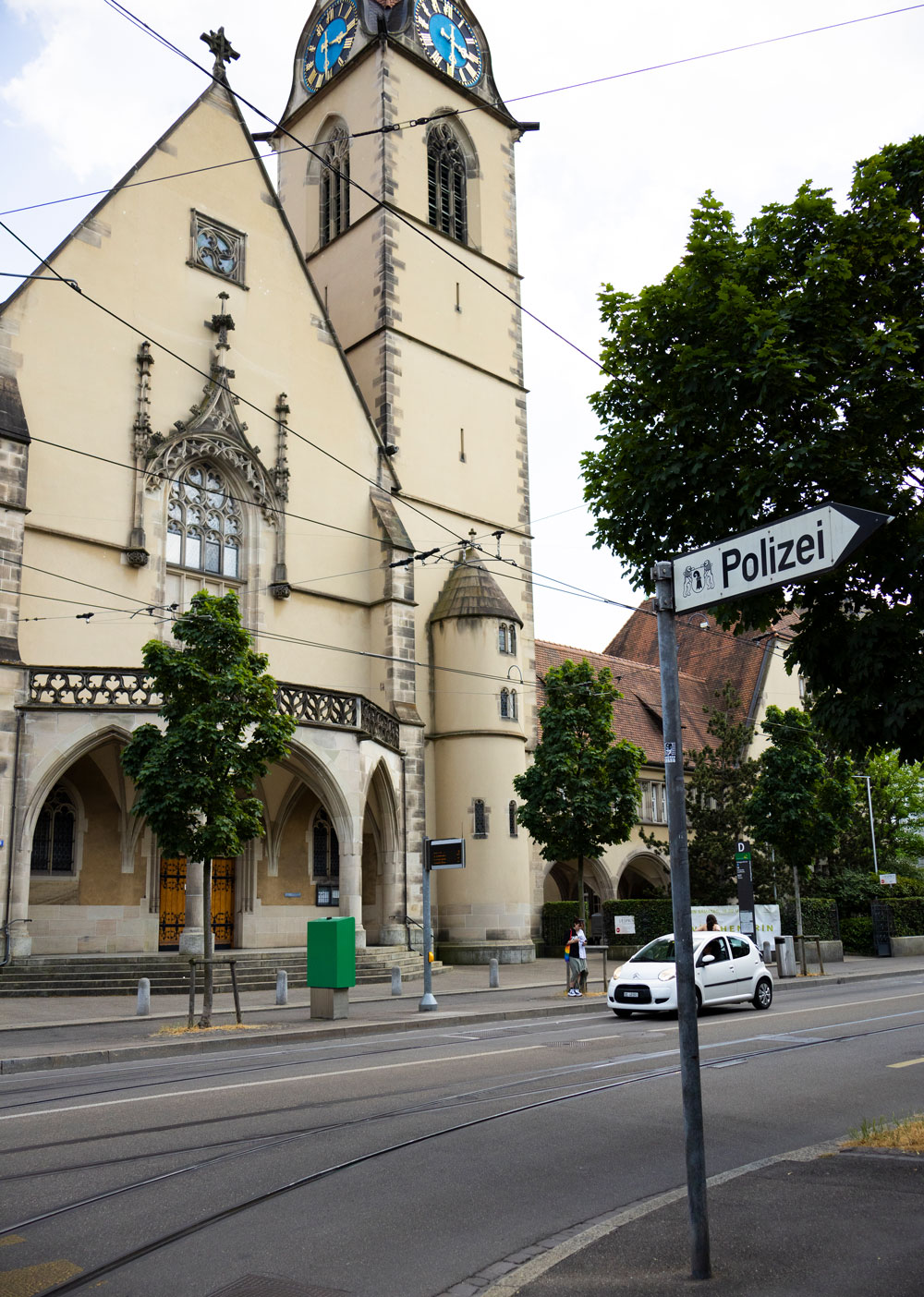 Heiliggeistkirche in Basel, über der Strasse steht ein Polizeischild.