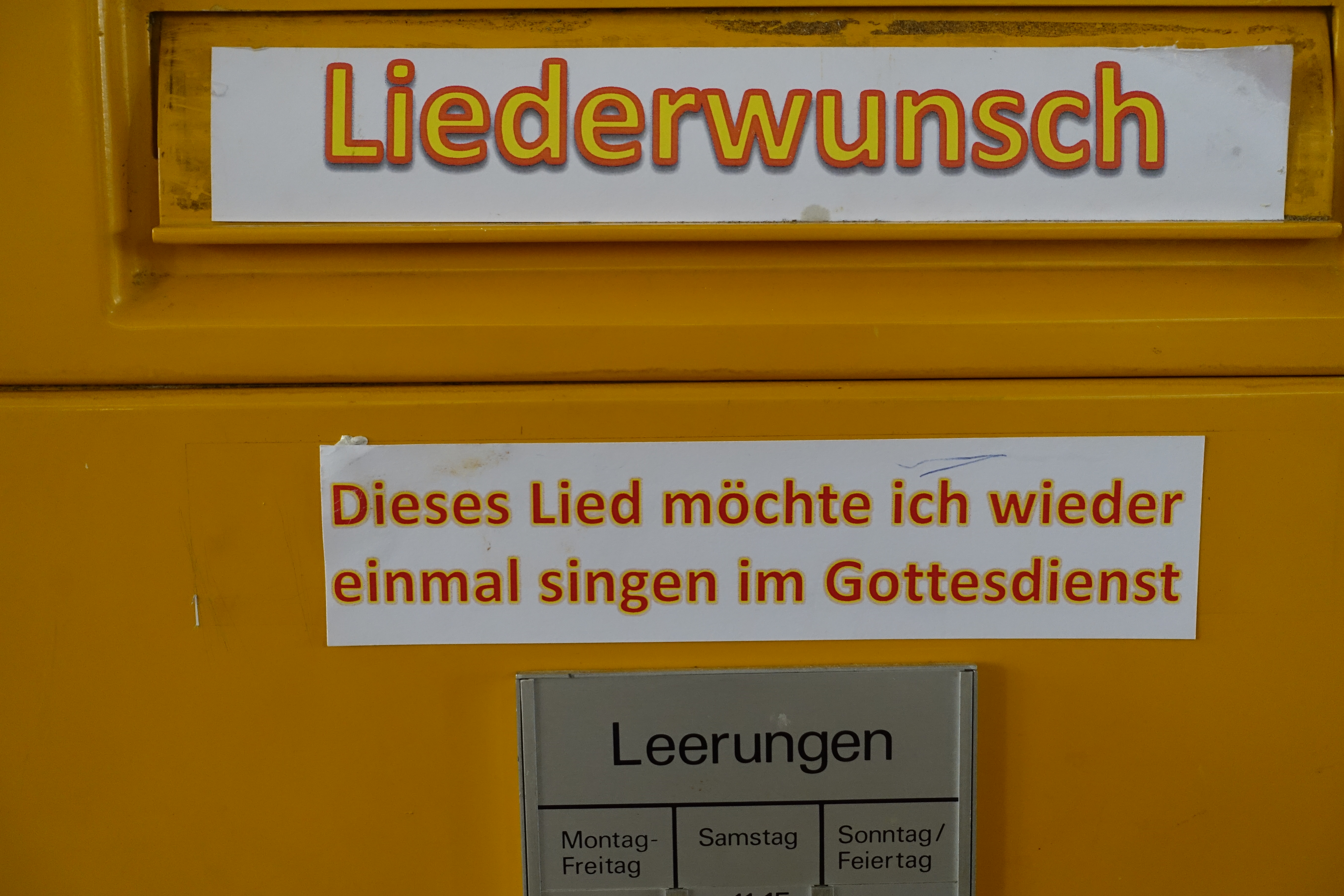 Staunen lässt in der evangelischen Kirche von Heiden der alte Briefkasten, der eine neue Aufgabe erfüllt: Unübersehbar wird zum Einwurf von Liedervorschlägen aufgefordert. Wer sich beteiligt, kommt in den Genuss eines Gottesdienstes mit persönlichem Wunschkonzert.