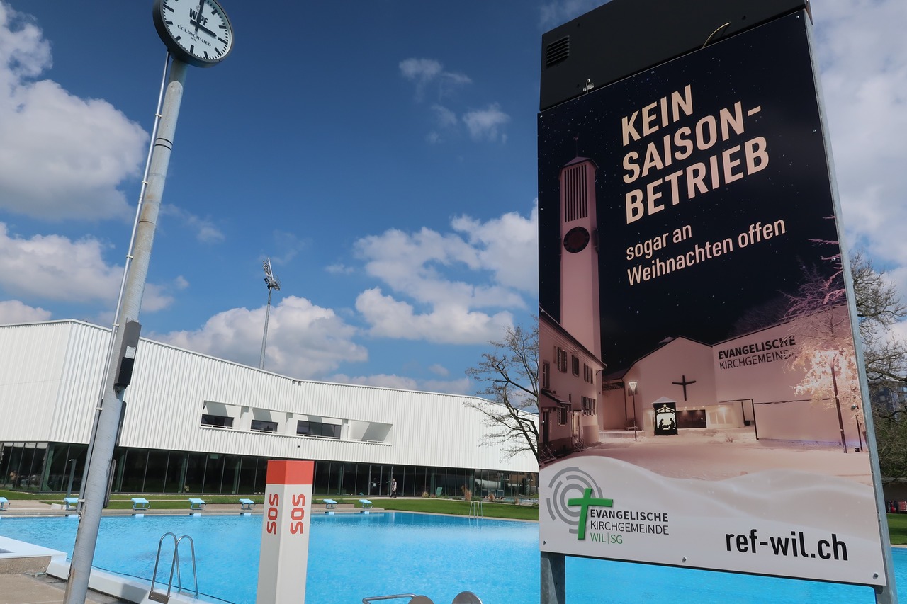 Nun ist die reformierte Kirchgemeinde Wil wieder mit einem Plakat in der Badi präsent. «Kein Saisonbetrieb», lautet heuer der Slogan. Die abgebildete, tief verschneite Kirche erinnert daran, dass die Kirche immer offen ist. Sogar an Weihnachten.
