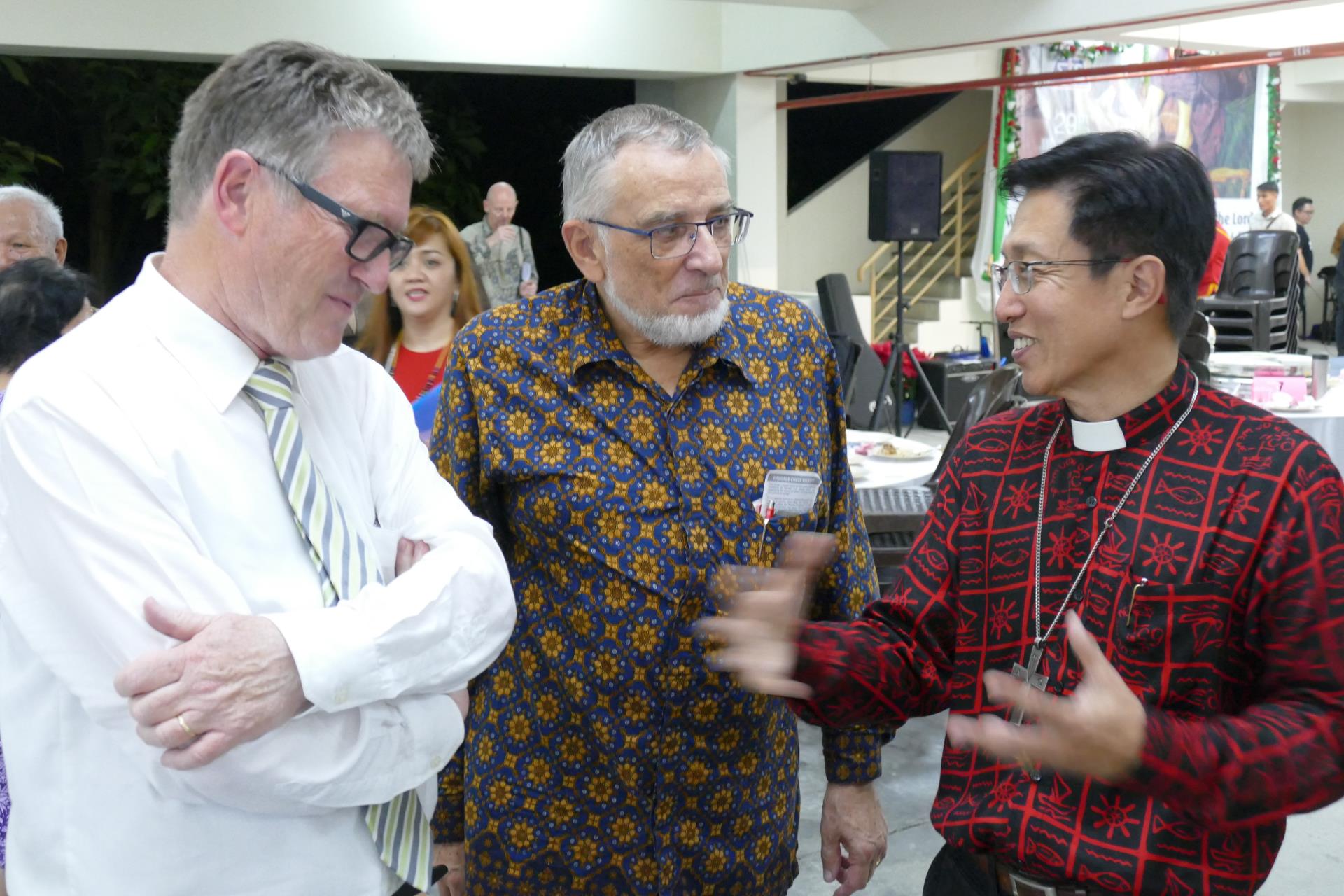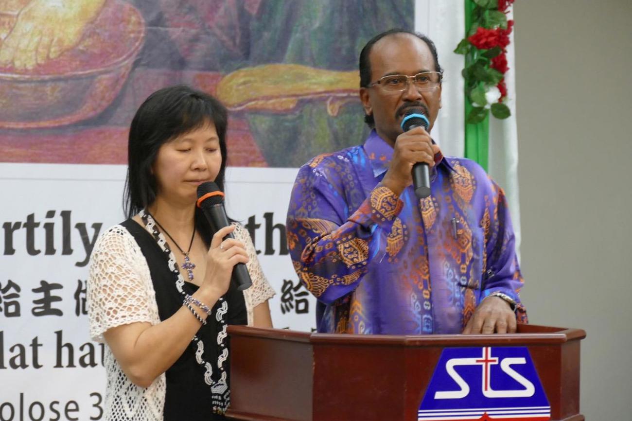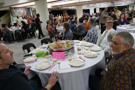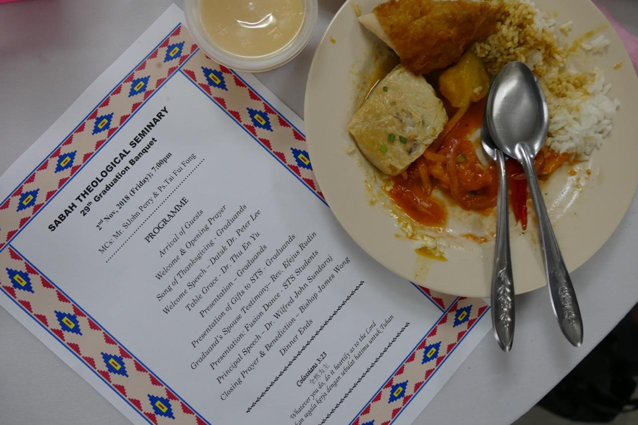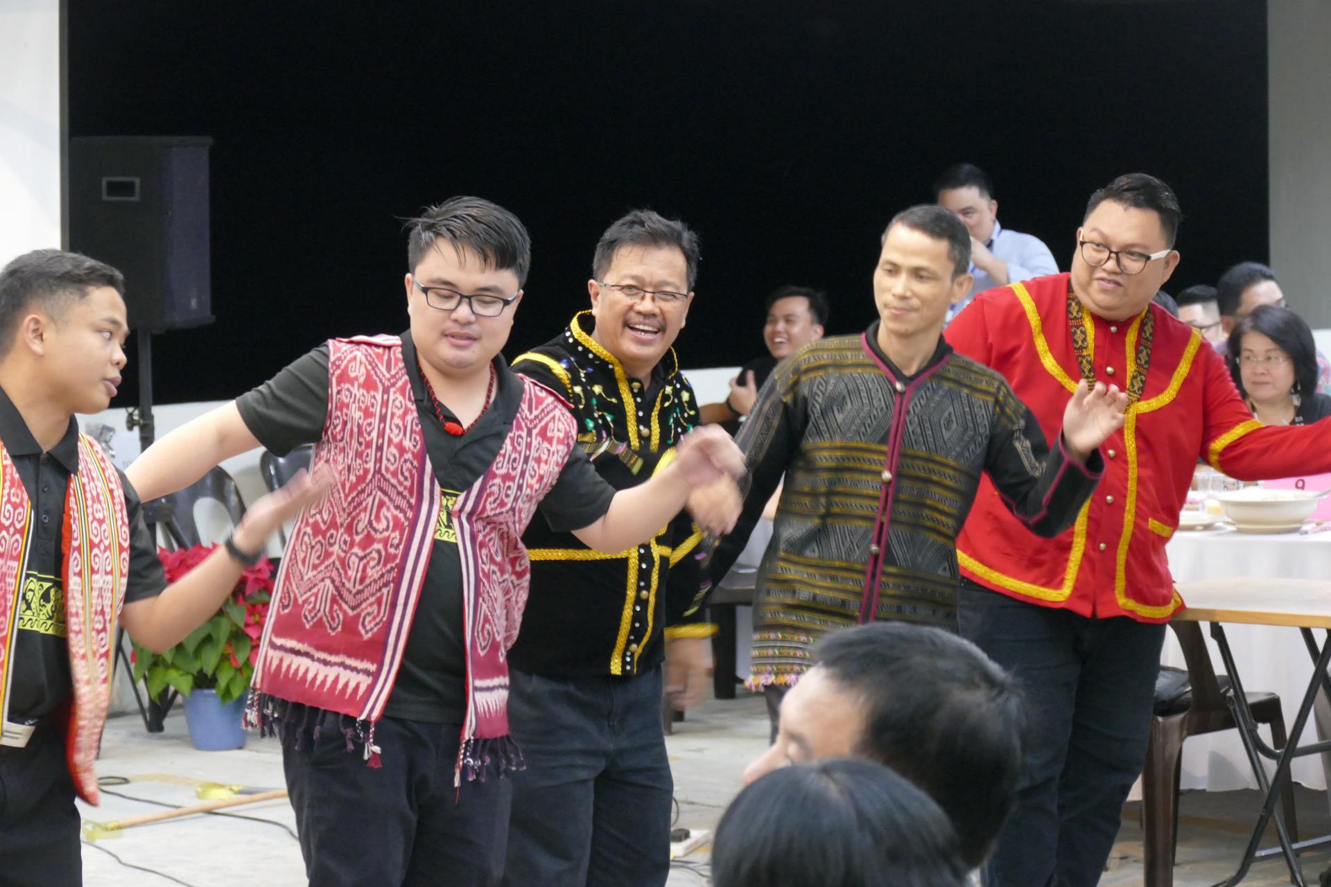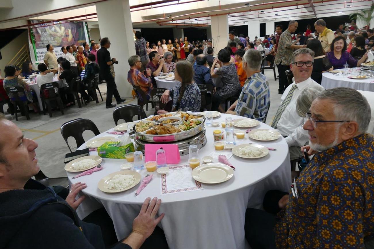 Aus der Tiefgarage des Theologischen Seminars schallt uns fröhliche Musik entgegen - das Essen ist schon im vollen Gange. Die Studierenden mit ihren Familien und Gästen sitzen an runden Tischen. Vorne wird auf Chinesisch und Malay gesprochen und später auch getanzt.