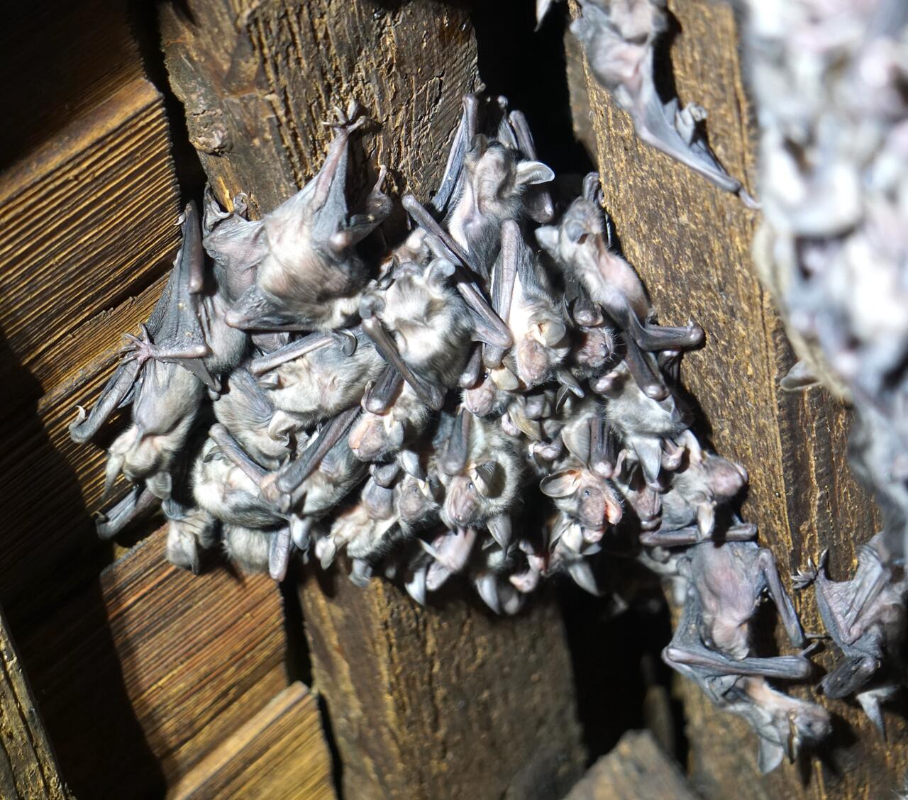 Wenige Tage zuvor sind die Jungtiere zur Welt gekommen. Wegen des nasskalten Frühsommers hatte sich die Geburt etwas verzögert. Schon in der ersten Nacht hängen die jungen Mausohren am bereits voll ausgebildeten Fuss kopfüber in einer grossen Traube. Ihre Mütter – Fledermausmütter sind alleinerziehend – sind am Jagen. Nur vereinzelte erwachsene Tiere sind dageblieben. «Kindergärtnerinnen» nennt sie René Güttinger.