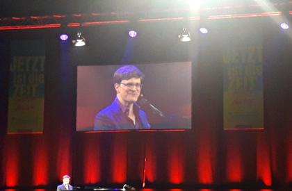 Dort stehen schon ziemlich viele Leute in der Schlange. Sie wollen zum Konzert von Bodo Wartke, das allerdings erst in zweieinhalb Stunden beginnt. Das wollen Marit und ich auch – ebenso die Thurgauer Pfarrerin Caren Algner, die auch auf dem Kirchentag ist und mich ansimst! Als Präsidiums- und Organisationsleitungsmitglieder dürfen wir uns etwas später anstellen und erhalten doch noch Sitzplätze. Wir schleusen Caren mit hinein – und was dann folgt, ist ein Konzert der musikalischen und sprachlichen Spitzenklasse. Die Halle ist mit 5000 Leuten voll besetzt, und der Applaus dröhnt auch in den Ohren. Zum Schluss schwenken wir das Handy-Pendant der Feuerzeuge, und ich hab mal wieder eine Rührungskröte im Hals…