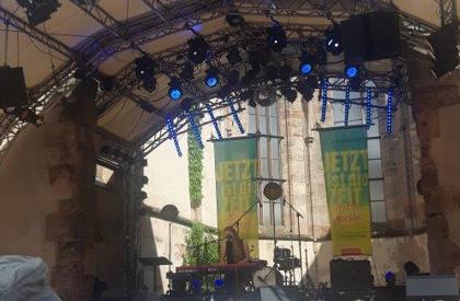 Auf dem Plan sehe ich, dass in der Katharinenruine eine Bühne stehen soll, auf der den ganzen Nachmittag Musik stattfindet. Ich komme gerade rechtzeitig zum Konzert von Jelena Herder, einer wunderbar poetischen Sängerin. Und treffe dort Marit vom Kirchentag. Wir setzen uns auf den Boden, die Sonne scheint, die Sängerin trifft einige Lebensnerve, und ich habe Lust, hier ewig liegenzubleiben. Nachher tritt Siegfried Fietz auf, Held meiner Jugendlieder. Ich merke allerdings, dass diese Jugend doch schon eine Weile zurückliegt, und mache deswegen mich auf den Weg in die Messe.
