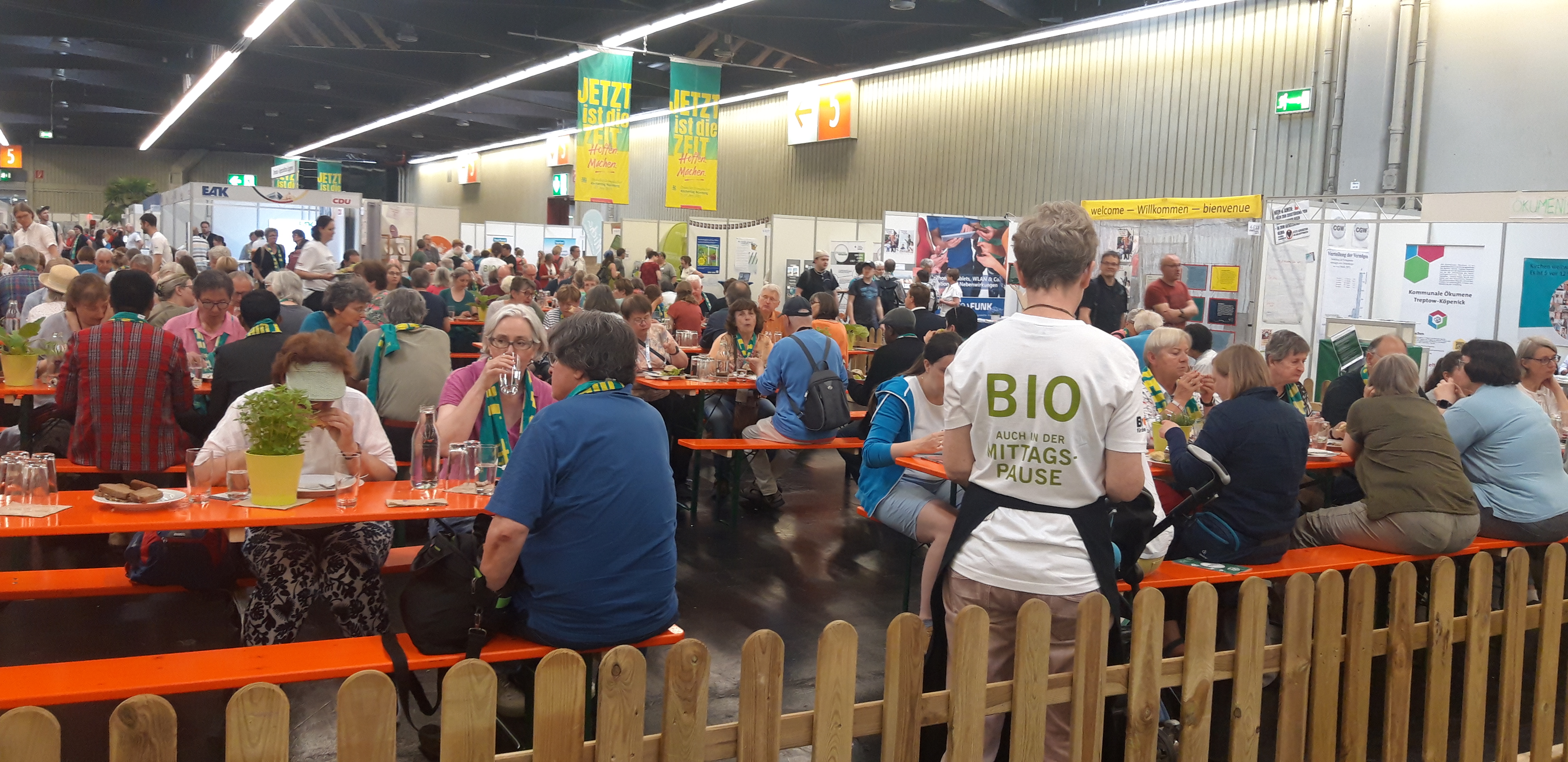 Der Wecker klingelt um 7 Uhr … mitten in der Nacht. Aber es ist Kirchentag, schlafen kann ich dann wieder zuhause! Beim Frühstück geht es schon gleich los – Silvia fällt mir um den Hals, mit ihr habe ich in Tübingen studiert, dort winkt Hans Werner, Vorsitzender der Konferenz der Landesausschüsse, hier ist Kira, Theologiestudentin mit Mann und Kind, und zu Tisch lerne ich Heike Springhart kennen, seit letztem April Landesbischöfin in Baden. Spannender Austausch zu «wie ist bei Euch/bei uns?»!
