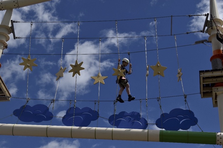 Alle anderen genossen währenddessen den freien Abend und irgendwann verschlug es auch die Jugendlichen ins Bett. Fit und munter teilten die Familien sich am nächsten Morgen in zwei Gruppen auf: Die einen lernten alles über das Pferd: striegeln, den Stall ausmisten und sogar reiten, ohne herunterzufallen; auch die anderen versuchten, nicht herunterzufallen, waren auf dem Klettergerüst aber zum Glück gesichert.