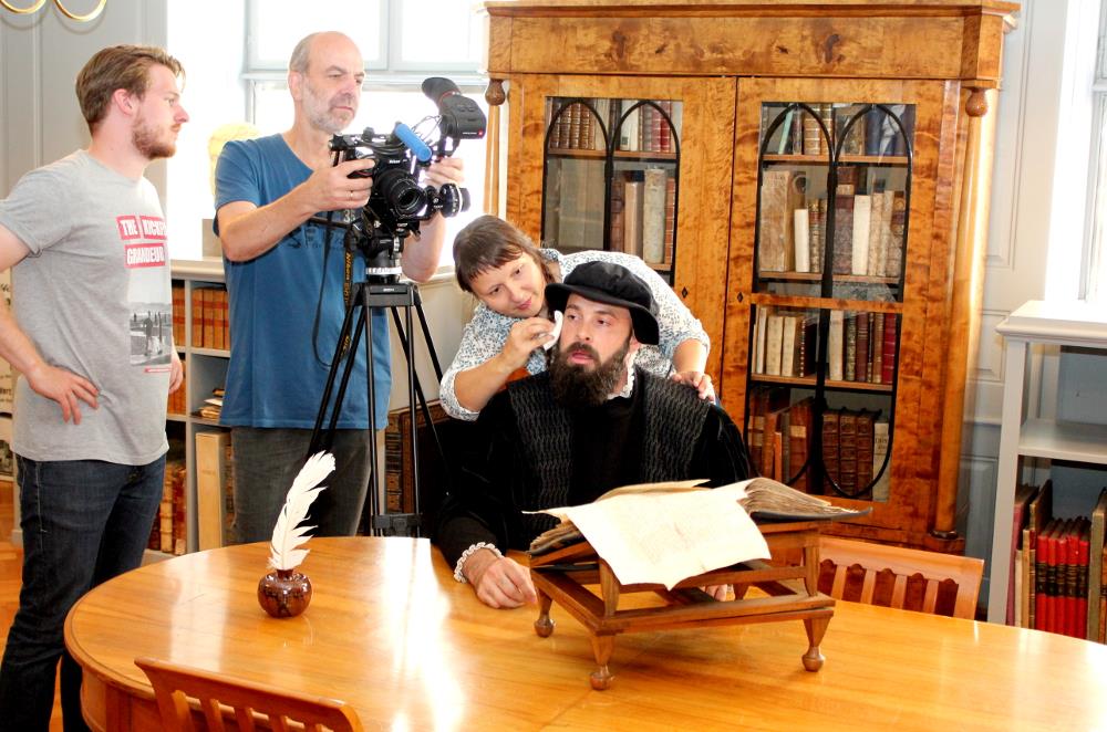 Calvins Augen gleiten über die Seiten des alten Buches. Der dichte Bart und seine schwarze Robe verleihen ihm die Strenge, die die Genfer so fürchteten. «Nein so geht das nicht», unterbricht Rainer Wälde die Dreharbeiten. «Das sieht so aus, als würdest du dein Handy lesen. Die Augen müssen ruhiger sein. Und das Ganze glänzt mir zu fest», ruft der Regisseur in den Raum. Sofort eilt die Maskenbildnerin herbei, um Calvin den Schweiss der historischen Last aus dem Gesicht zu tupfen.