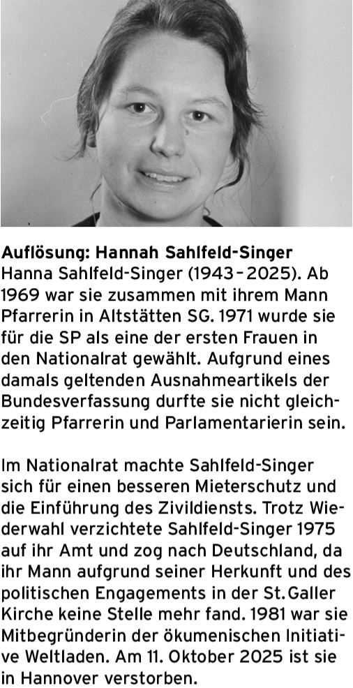 Wer ist die gesuchte Pfarrerin und Politikerin? Die Rätsel-Auflösung erfolgt mit einem Klick auf das Bild.